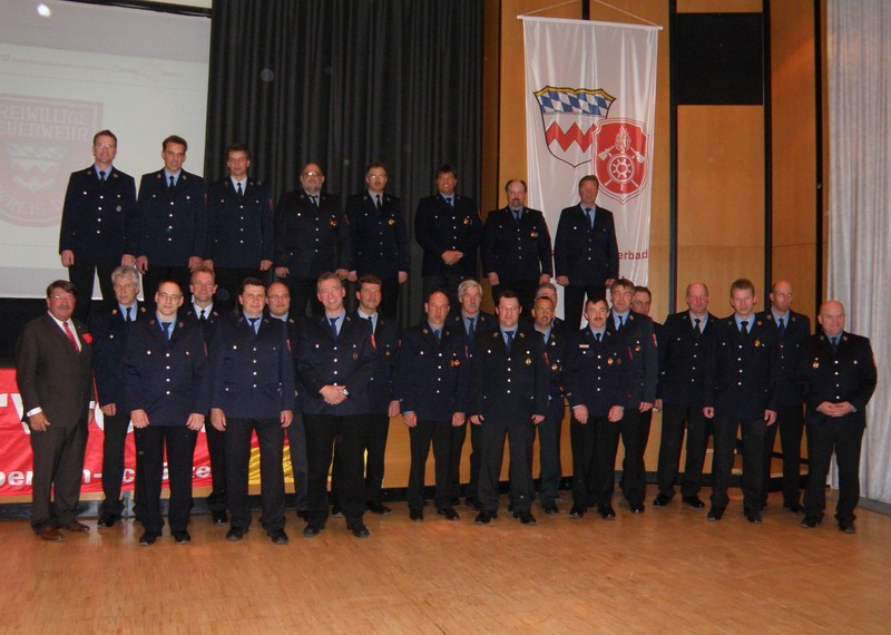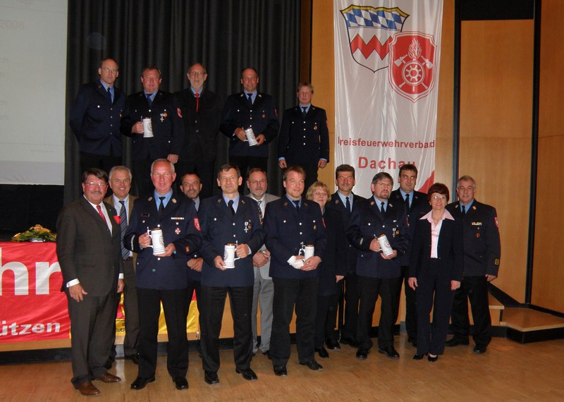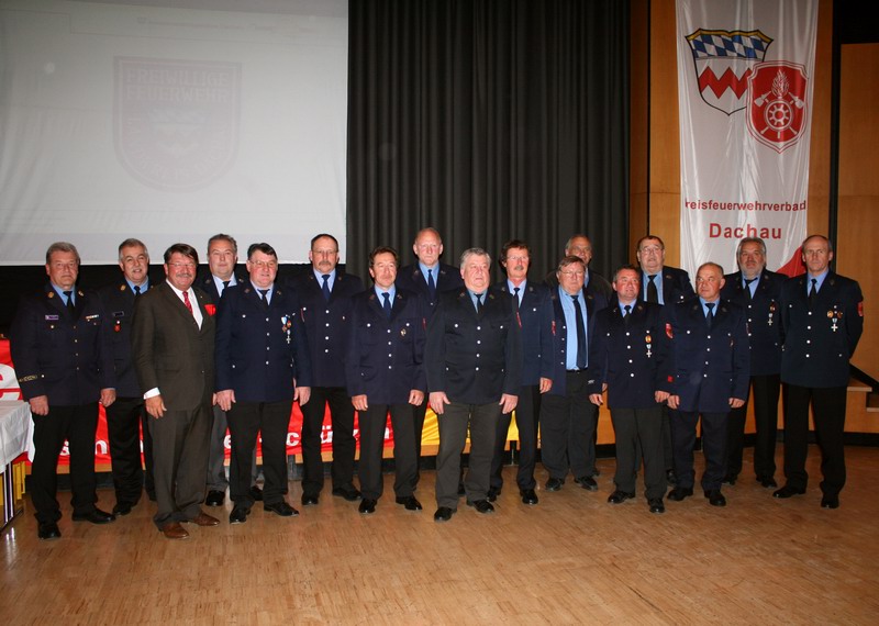 Im festlich geschmückten Saal der ASV-Theaterhalle in Dachau fand diesmal der schon zur Tradition gewordene Ehrenabend der Kreisbrandinspektion Dachau statt, bei dem 16 Feuerwehrdienstleistende die staatliche Auszeichnung für 40- jährige und weitere 41 die Auszeichnung für 25-jährige aktive Dienstzeit in den Freiwilligen Feuerwehren des Landkreises Dachau erhielten. Ferner wurden sechs Feuerwehrkommandanten verabschiedet, sowie eine Arbeitgeberehrung und vier Ehrungen im Auftrag des Deutschen Feuerwehrverbandes und des Landesfeuerwehrverbandes Bayern durchgeführt.Kreisbrandrat Rudi Reimoser konnte dazu neben Landrat Hansjörg Christmann, als „Hausherrn“ Dachaus Bürgermeister Claus Weber, die Mitarbeiterinnen des SG 30 des Landratsamtes Dachau, sowie die jeweils zuständigen Bürgermeister, Kommandanten und Jubilare, sowie die ehemaligen Mitglieder und Angehörigen der Kreisbrandinspektion willkommen heißen.