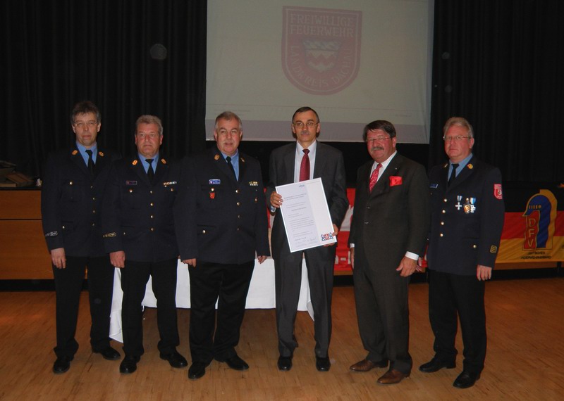 Vom Verband der Bayerischen Wirtschaft und dem Landesfeuerwehrverband Bayern konnte Kreisbrandrat Rudi Reimoser zusammen mit Landrat Hansjörg Christmann am Ehrenabend der Kreisbrandinspektion Dachau eine Urkunde für Verdienste um das Feuerlöschwesen in Bayern an die Firma Sumitomo Cyclo Germany aus Markt Indersdorf übergeben.Mit der sogenannten „Firmenehrung“ will sich die Kreisbrandinspektion und der Kreisfeuerwehrverband bei den Arbeitgebern bedanken, die Feuerwehrkameraden bei Einsätzen oder Lehrgängen vom Dienst freistellen. Es ist heute längst keine Selbstverständlichkeit mehr, so Reimoser, dass es Arbeitgeber uneingeschränkt hinnehmen, dass Arbeitnehmer, die ehrenamtlichen Feuerwehrdienst leisten, z.B. bei einem Alarm den Arbeitsplatz verlassen und zum Einsatz eilen.