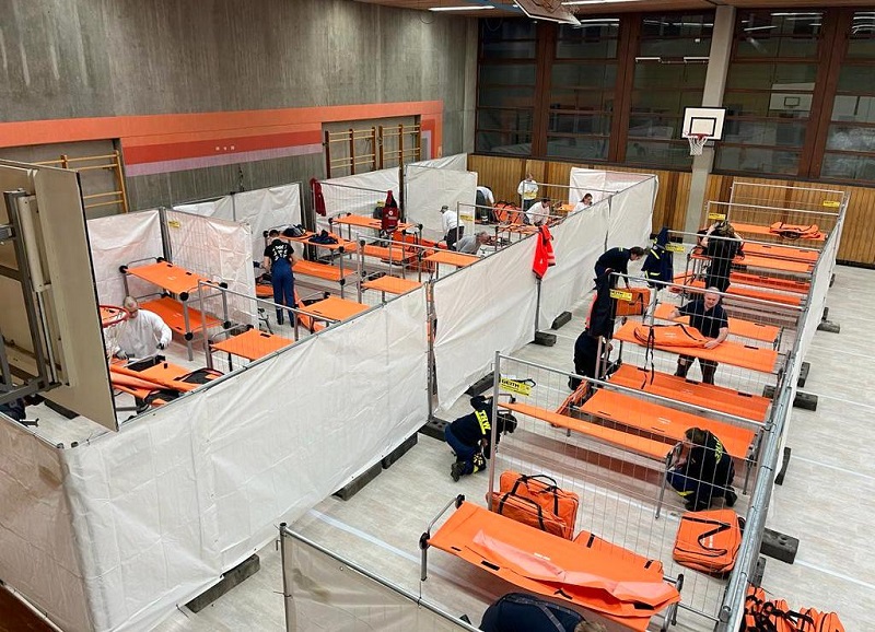 Somit wurden Unterbringungsmöglichkeiten für ca. 140 Personen geschaffen, der Aufbau dauerte vier Stunden. Vorbereitend haben die Gerätewarte des Katastrophenschutzzentrums zusammen mit Kameraden der Feuerwehr Hebertshausen sowie der Kreisbrandinspektion bereits am Vortag die landkreiseigenen Logistikfahrzeuge mit Betten, Bettwäsche, Handtüchern und Biertischgarnituren beladen, so dass am Donnerstag eine zügige Zuführung in die Steinstraße gegeben war.