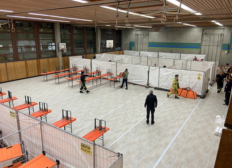 Der Landkreis Dachau bereitet sich weiter auf die Aufnahme von Flüchtlingen vor. Vor diesem Hintergrund haben Einsatzkräfte von BRK, Feuerwehr und THW am vergangenen Donnerstag (02.03.2023) eine Notunterkunft in der Schule an der Steinstraße in Dachau eingerichtet.