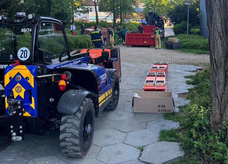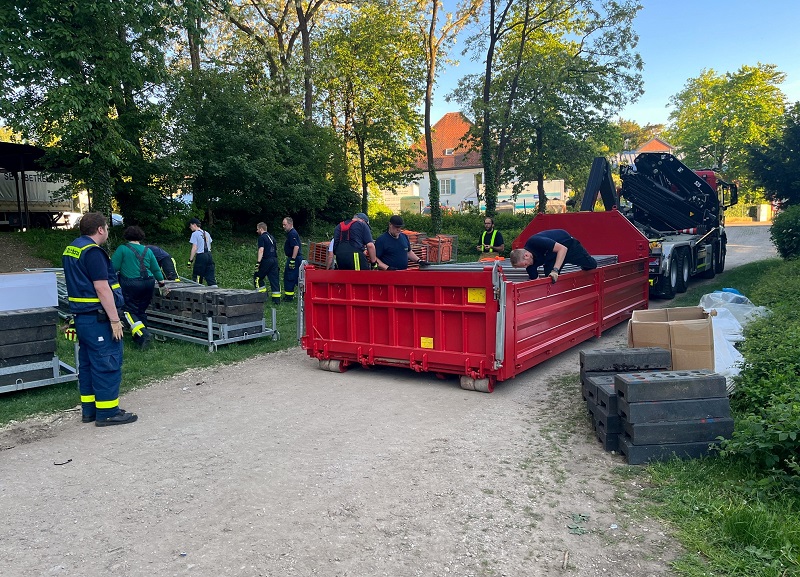 Elektroverteiler, Kabel, Tische, Bänke, Feldbetten und Bauzäune wurden abgebaut, auf Logistikfahrzeuge verladen und zum Katastrophenschutzzentrum nach Hebertshausen transportiert.