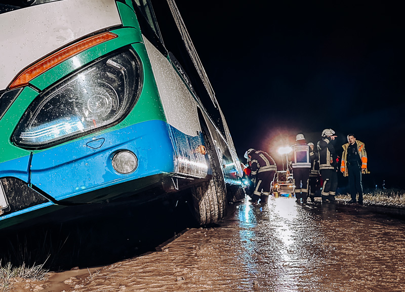 Am Donnerstagabend (04.09.2025) wurde die Feuerwehr Unterweikertshofen um 23.05 Uhr zu einem Doppeldeckerbus zwischen Unterweikertshofen und Langengern alarmiert, der während eines Starkregens von der Fahrbahn abgekommen und in den Straßengraben gerutscht war.Vor Ort zeigte sich, dass die Fahrbahn durch das Unwetter vollständig mit Schlamm bedeckt war. Diese rutschigen Straßenverhältnisse führten auch dazu, dass der Bus von der Fahrbahn abkam. Das Fahrzeug geriet dabei in Schräglage und drohte umzukippen. Im Bus befand sich nur der Fahrer, der glücklicherweise unverletzt blieb. Er wurde von der Feuerwehr aus dem Fahrzeug befreit.