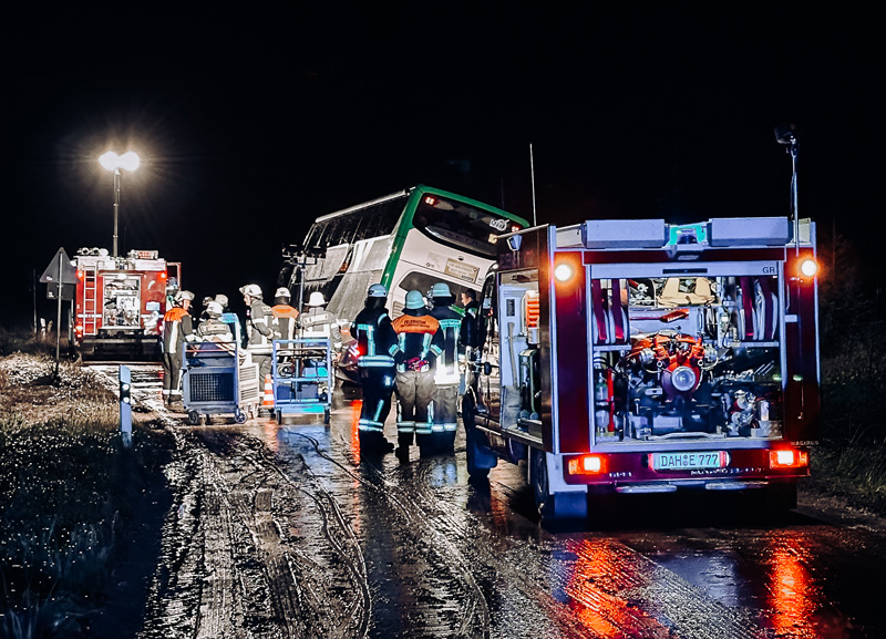 Doppeldeckerbus rutscht bei Unterweikertshofen in den Straßengraben – aufwendiger Einsatz bis in die Morgenstunden