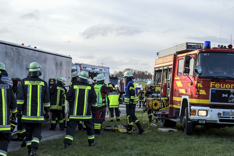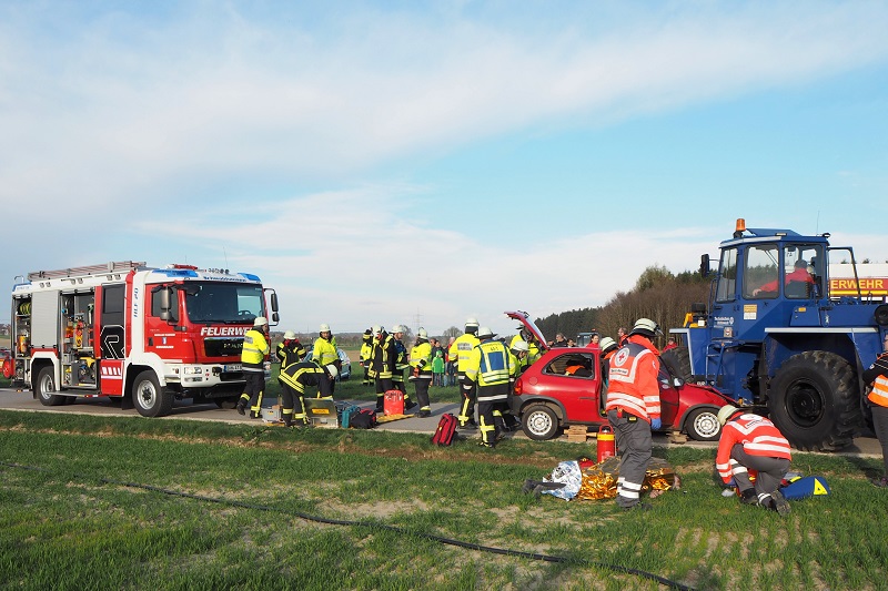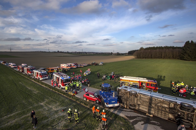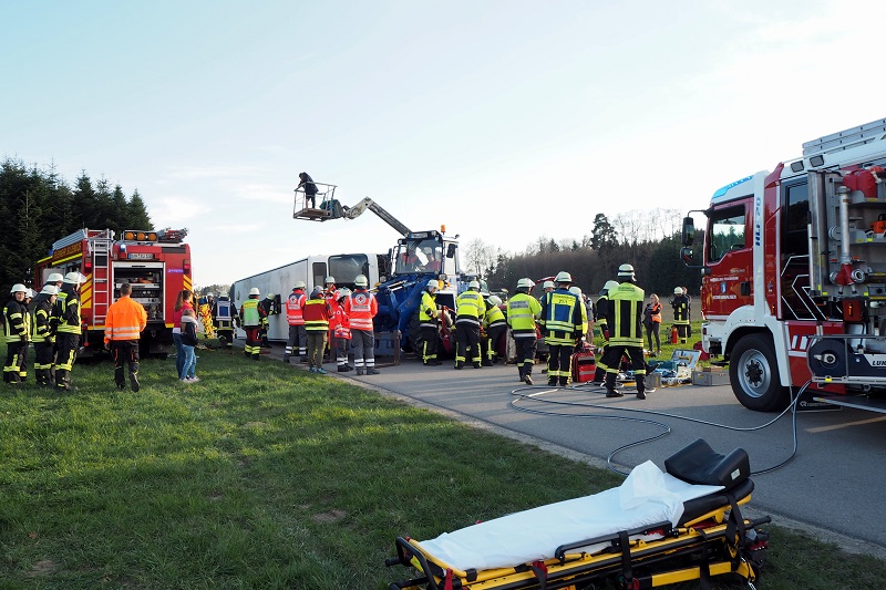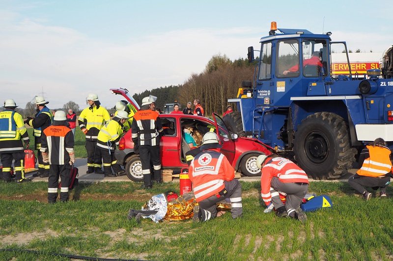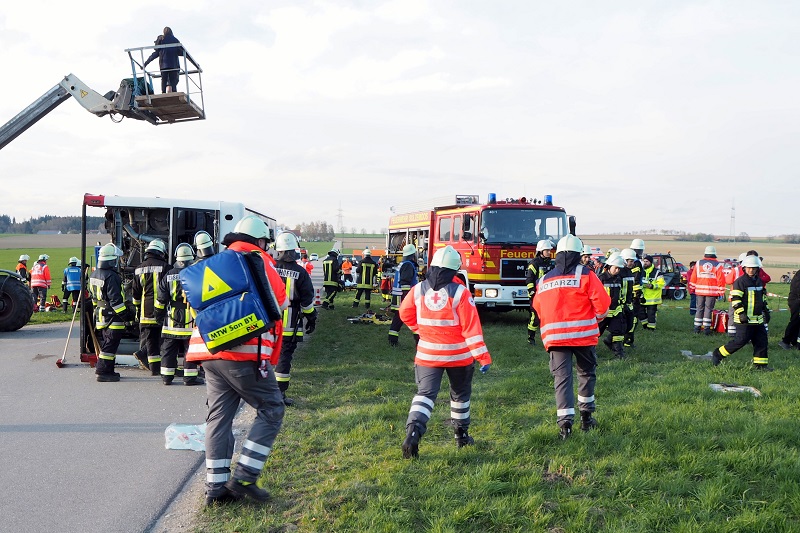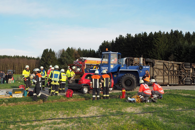 Ein nichtalltägliches Übungsszenario haben Feuerwehr, Rettungsdienst und Technisches Hilfswerk am vergangenen Freitag (13.04.2018) nahe Lindach (Gemeinde Schwabhausen) absolviert; bei einem Verkehrsunfall ist ein Linienbus umgestürzt, zudem war ein mit zwei Personen besetzter PKW unter einem Radlader eingeklemmt, dessen Fahrer es ebenfalls zu retten galt.