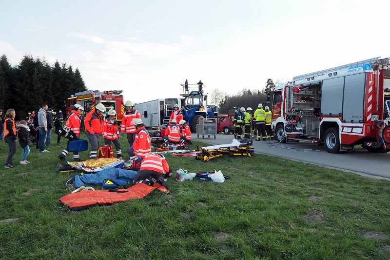 Die ersten Rettungskräfte haben umgehend mit der Betreuung der Verletzten begonnen und die technische Rettung aus dem verunfallten PKW mit hydraulischen Rettungsgerät vorbereitet. Parallel dazu drangen die ersten Einsatzkräfte in den umgestürzten Bus vor, um die mit verschiedenen Verletzungsmustern geschminkten Personen zu befreien und an den Rettungsdienst zu übergeben, der auf der angrenzenden Wiese eine Patientenablage errichtet hat.