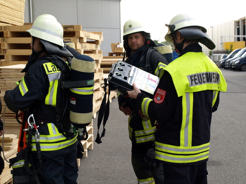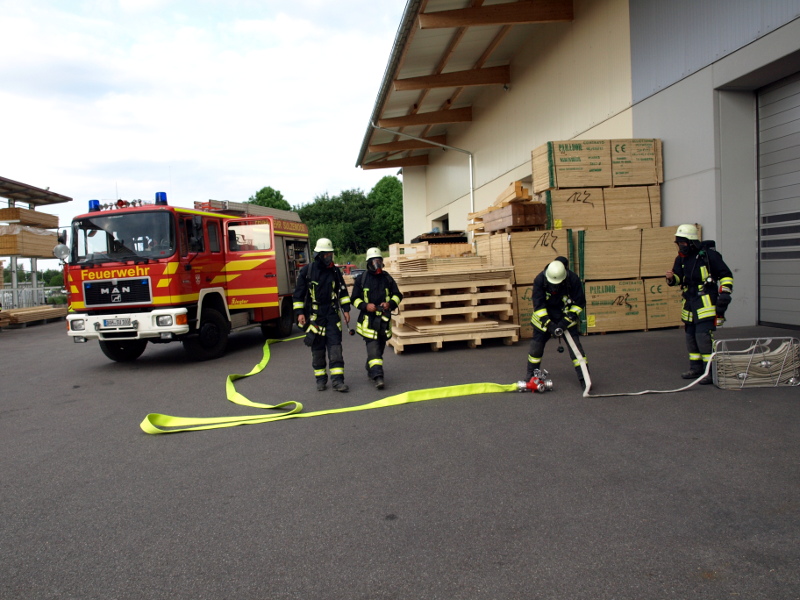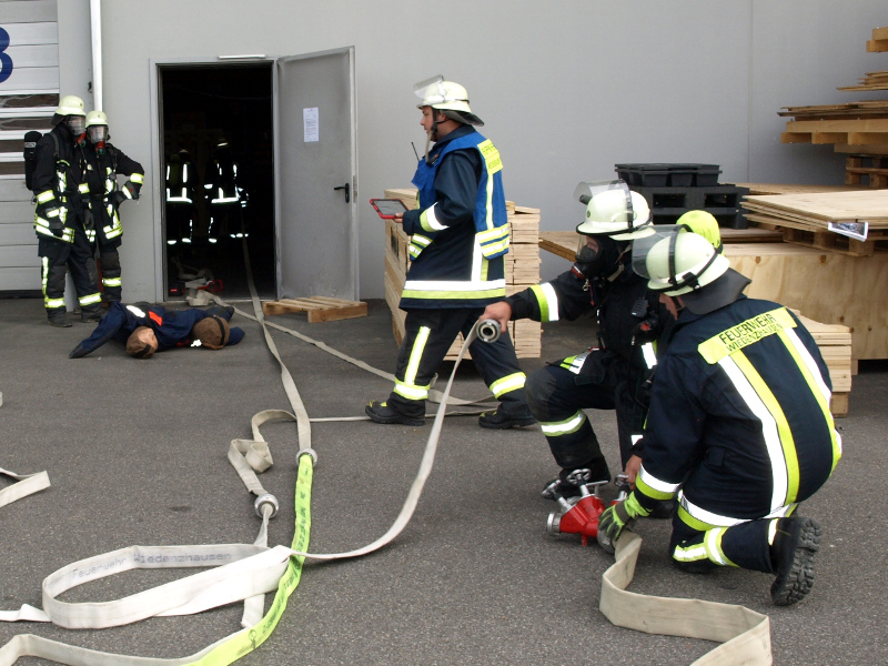 Das Einsatzszenario: In der Lagerhalle dieser Firma, dabei handelt es sich um einen Schreinereibetrieb, der Transportverpackungen aus Holz für den Industriebereich herstellt, war ein Brand ausgebrochen. Mehrere Personen wurden noch im Gebäude vermisst.