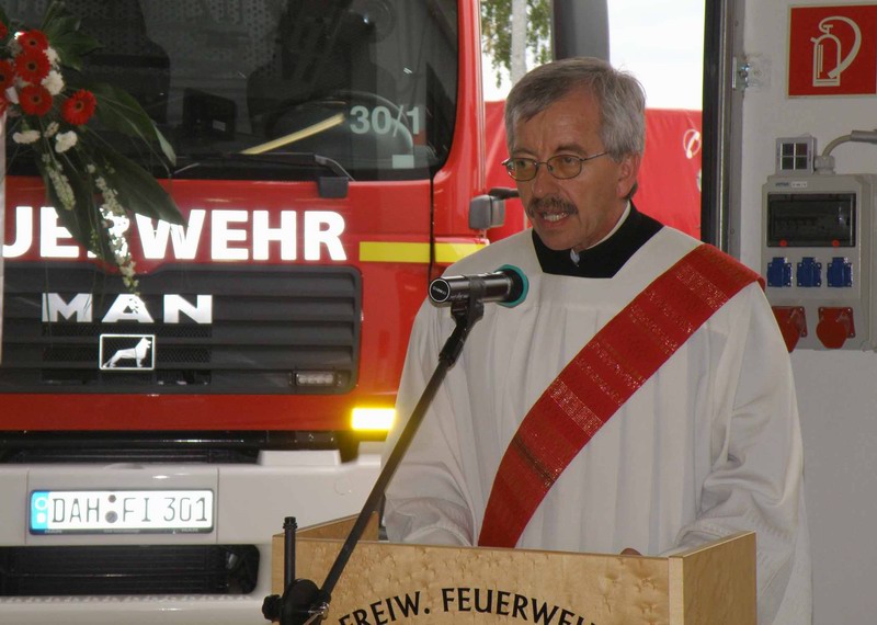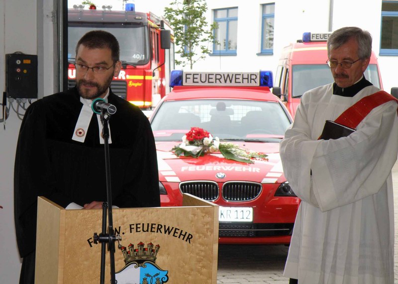 Die Segnung der Fahrzeuge nahmen im Anschluß Diakon und Feuerwehrseelsorger Albert Wenning und Pfarrer Björn Schukat.