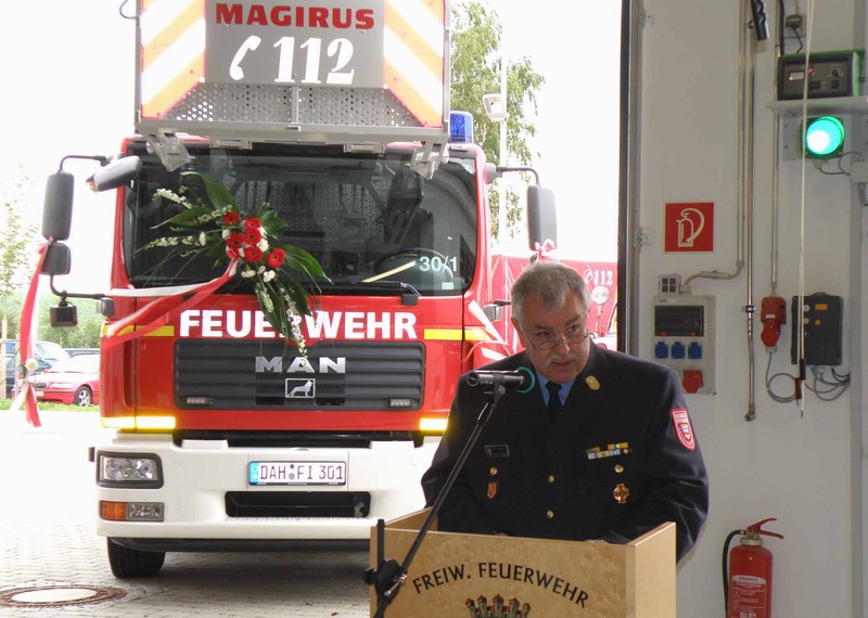 Bürgermeister Josef Kreitmeir und Kommandant Thomas Burgmair bedankten sich ebenfalls für die Beschaffung der Drehleiter mit Standort Indersdorf.