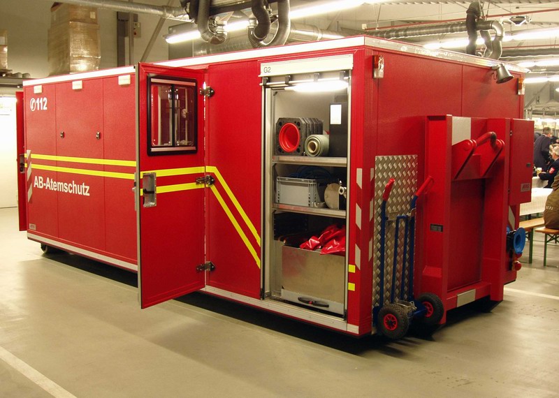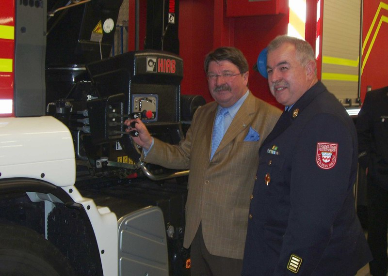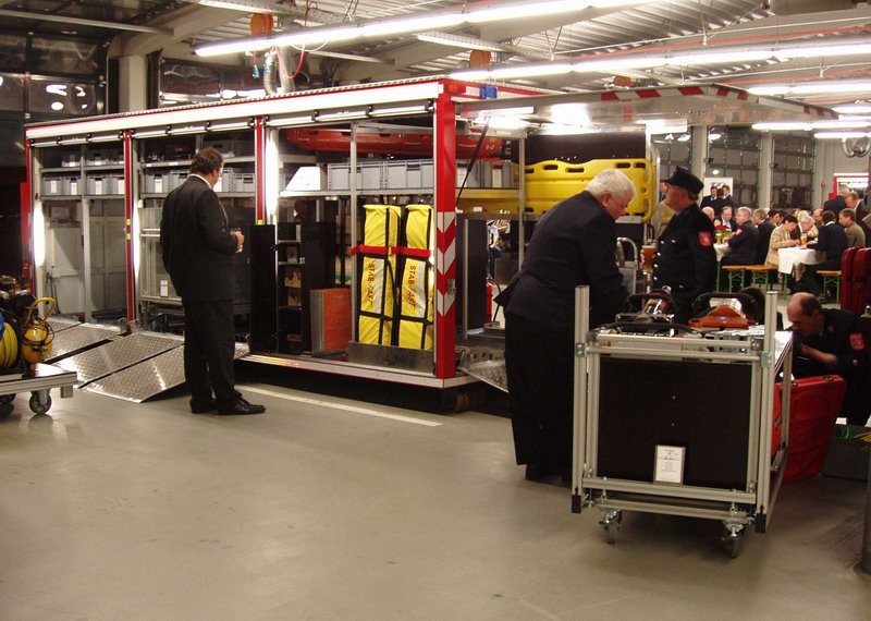 Stadtbrandinspektor Tonhauser erläuterte den Gästen die Technik der beiden Fahrzeuge; im Jahre 2005 wurde zusammen mit den Verantwortlichen der Feuerwehren des Landkreises und der Stadt ein Wechselladersystem erarbeitet, nachdem für den Rüstwagen und den Gerätewagen Atemschutz-Strahlenschutz der Stadt eine Ersatzbeschaffung notwendig wurde.