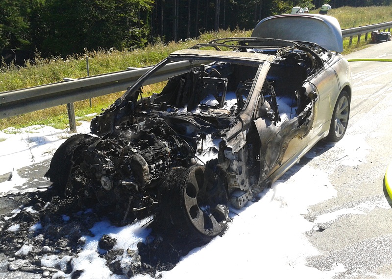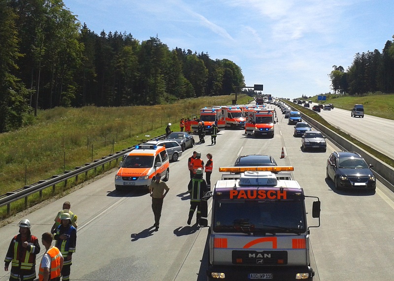 Elf Fahrzeuginsassen, darunter 6 Kinder, erlitten bei einem Verkehrsunfall am Sonntagvormittag (12.08.2012) auf der A8 zum Glück nur leichte Verletzungen.Der Unfall ereignete sich gegen 10.30 Uhr in Fahrtrichtung Augsburg nahe der Anschlussstelle Adelzhausen, als die Fahrerin eines 6er BMW aus noch ungeklärter Ursache auf einen Maserati prallte und beide Fahrzeuge anschließend gegen einen Opel Zafira geschleudert wurden. Das BMW Cabrio geriet durch den Aufprall in Brand und musste von der Feuerwehr mit Schaum abgelöscht werden.