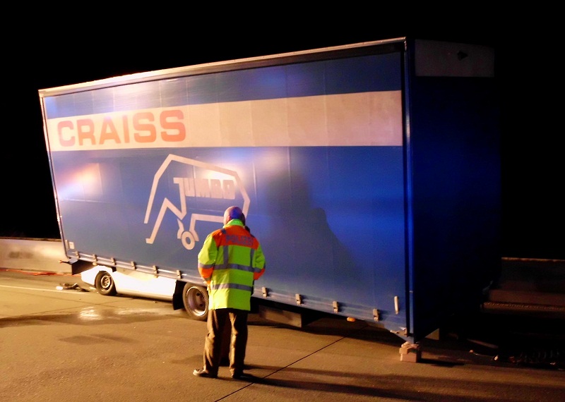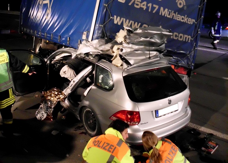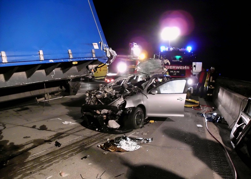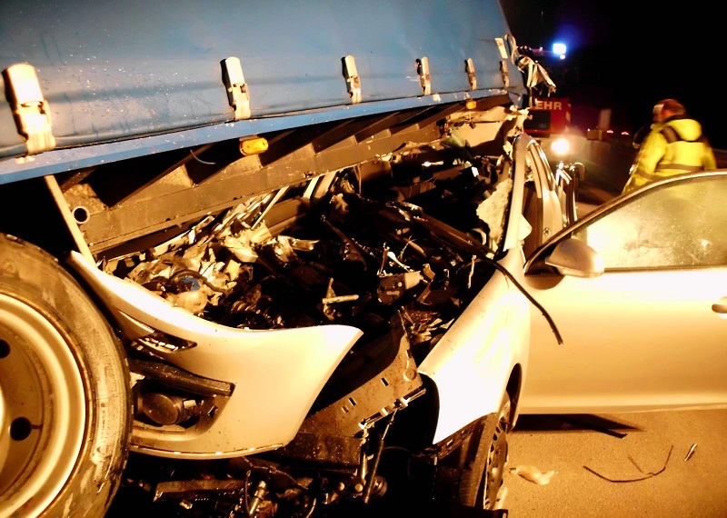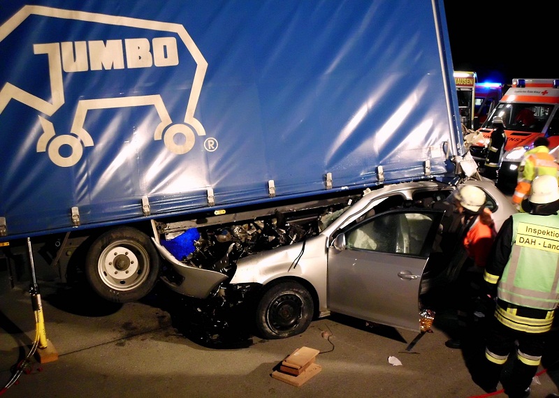 Erneut ist es am Montagabend gegen 20.30 Uhr zu einem schweren Verkehrsunfall auf der Autobahn A8 in Fahrtrichtung München gekommen.Aus noch ungeklärter Ursache ist ein 57-Jähriger mit seinem VW Golf in Höhe der Anschlussstelle Sulzemoos auf einen vorausfahrenden LKW-Anhänger aufgefahren. Durch den Aufprall wurde der Anhänger vom Zugfahrzeug getrennt und der Volkswagen schob sich fast vollständig unter den Auflieger, beide blieben rund 100 Meter nach der ursprünglichen Aufprallstelle liegen. Der Längsträger des Anhängers bohrte sich in das Fahrzeuginnere und verfehlte den Fahrer glücklicherweise nur um Haaresbreite.