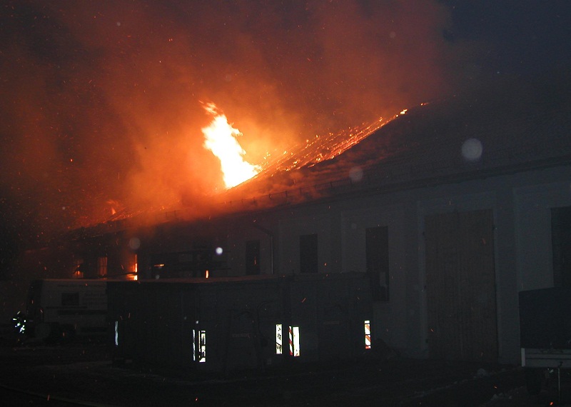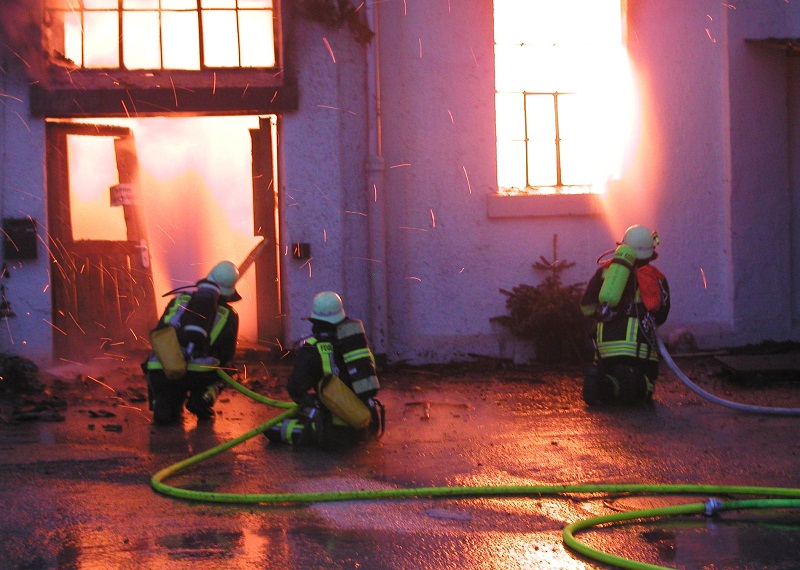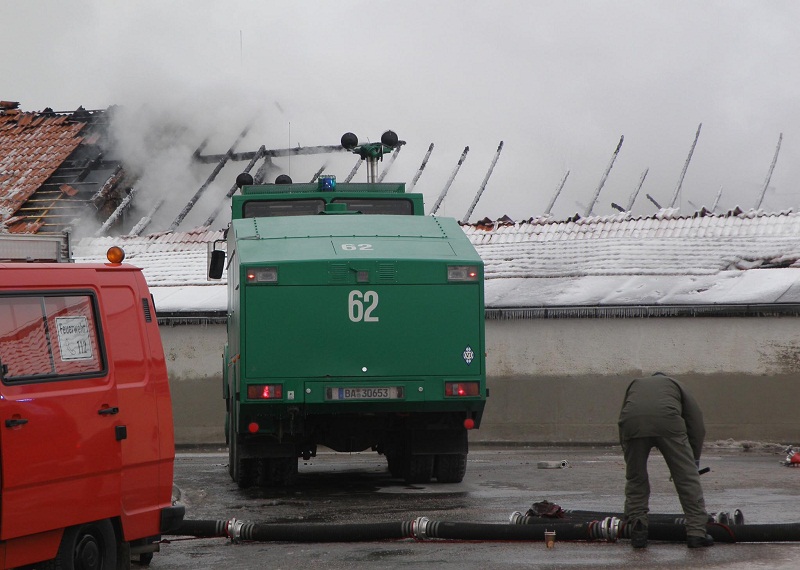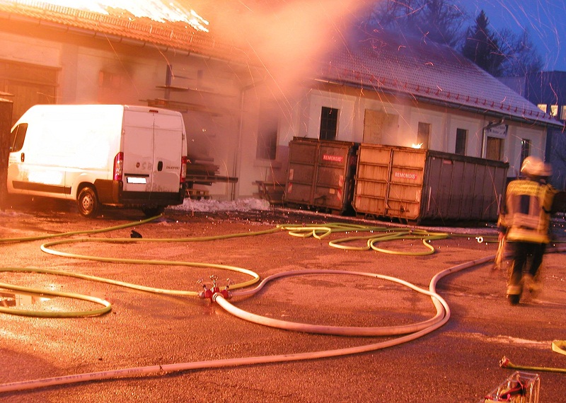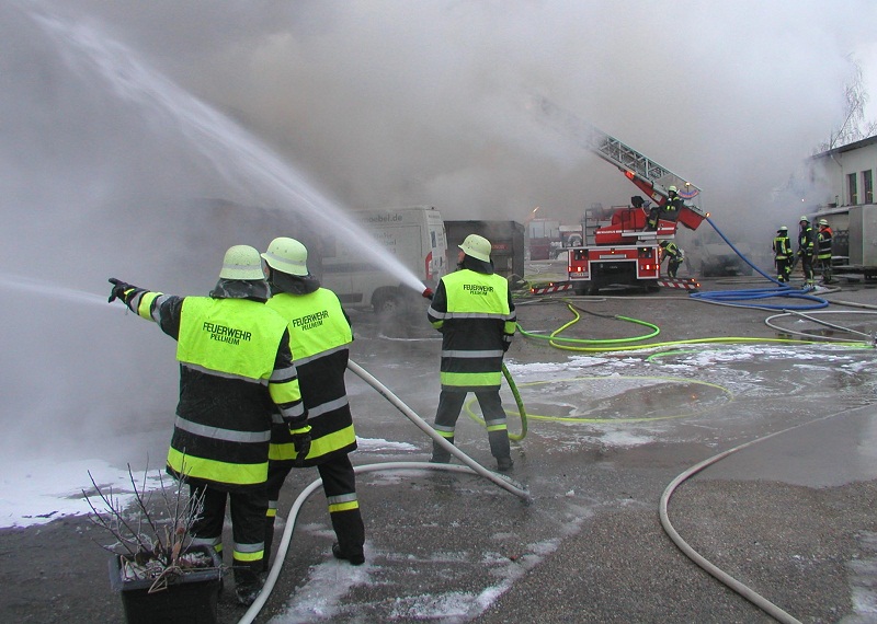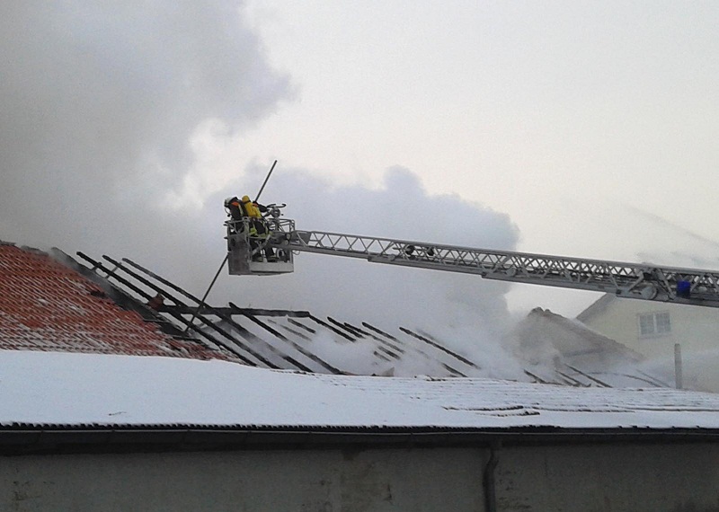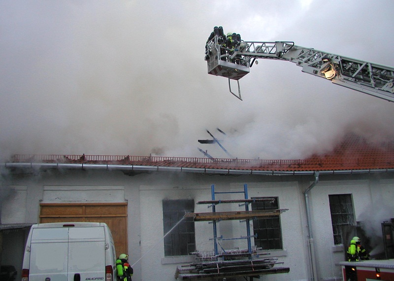 Ein erneuter Großbrand forderte die Feuerwehren um Dachau am Donnerstagmorgen (02.02.2012). Gegen 6.30 Uhr wurden die Einsatzkräfte zum Brand einer Schreinerei nahe der Dachauer Roßwachtstr. alarmiert.Beim Eintreffen der ersten Fahrzeuge stand ein Teil der ca. 30 m langen Halle bereits im Vollbrand. Das Hauptaugenmerk der Feuerwehr lag darin, die Brandausweitung durch Funkenflug zu verhindern. Neben der Schreinerei befindet sich noch ein metallverarbeitender Betrieb in der Halle, der von den Flammen abgeschirmt werden konnte. Ebenso konnte ein Übergreifen auf das direkt angrenzende Gelände der Bereitschaftspolizei verhindert werden, wo sich ein Unterkunftsgebäude der Auszubildenden befindet, welches vorsorglich evakuiert wurde.