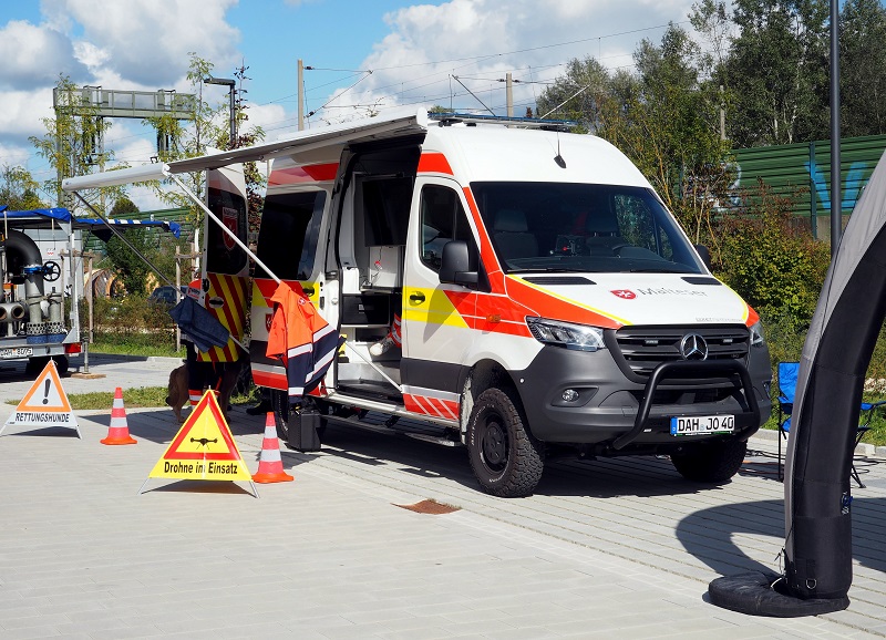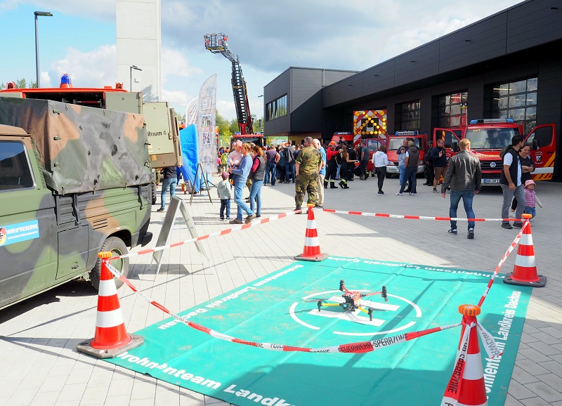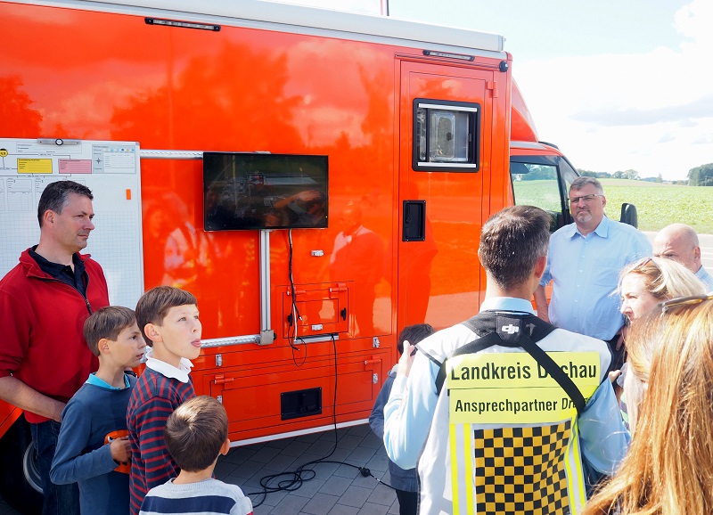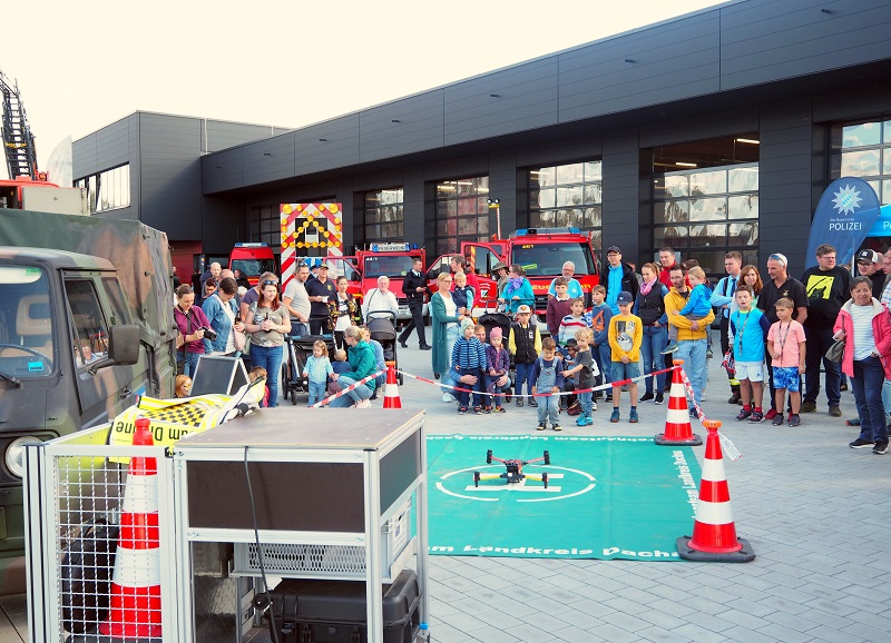 Ein Highlight für die Besucher waren der Feuerlöschtrainer sowie die verschiedenen Einsatzvorführungen. Die Feuerwehren der Gemeinde Petershausen demonstrierten dabei eine Fettexplosion sowie die Rettung einer Person über die Drehleiter, während die Malteser den Einsatz ihrer Rettungshunde vorführten. Zudem zeigten die Feuerwehr Röhrmoos sowie die Malteser den interessierten Besuchern die Möglichkeiten ihrer Drohnen bei Einsätzen sowie die Bildübertragung auf den Einsatzleitwagen der UG-ÖEL.
