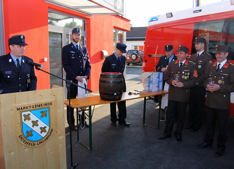Als Gastgeschenk wurde ein Fass bayrisches Bier und entsprechende Gläser bedruckt mit den beiden Wappen überreicht. Bürgermeister und Kommandant hatten die ehrenvolle Aufgabe das Fass anzuzapfen, was nach einigen Versuchen auch erfolgreich war. Die Kameraden sowie die Bevölkerung waren von dem bayerischen Gerstensaft sichtlich angetan. Bei einem gemütlichen Beisammensein in der Fahrzeughalle nahm die Feierlichkeit ihren Ausklang.