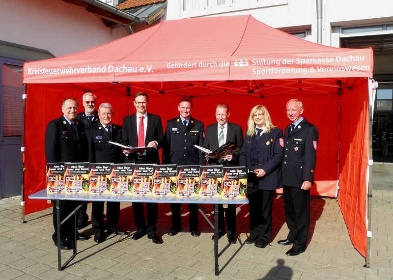 Auf dem Bild v.r.n.l.: Kreisbrandinspektor Paul Steier, stv. Vorsitzender des Kreisfeuerwehrbandes Klaus Zacherl, Kreisbrandrat Heinrich Schmalenberg, Sparkassenvorstand Thomas Schmid, Kreisbrandinspektor Georg Reischl, Sparkassen-Gebietsdirektor Josef Steinhardt, Brandschutzbeauftragte Monika Schneider und Kreisbrandmeister Ludwig Kraut.