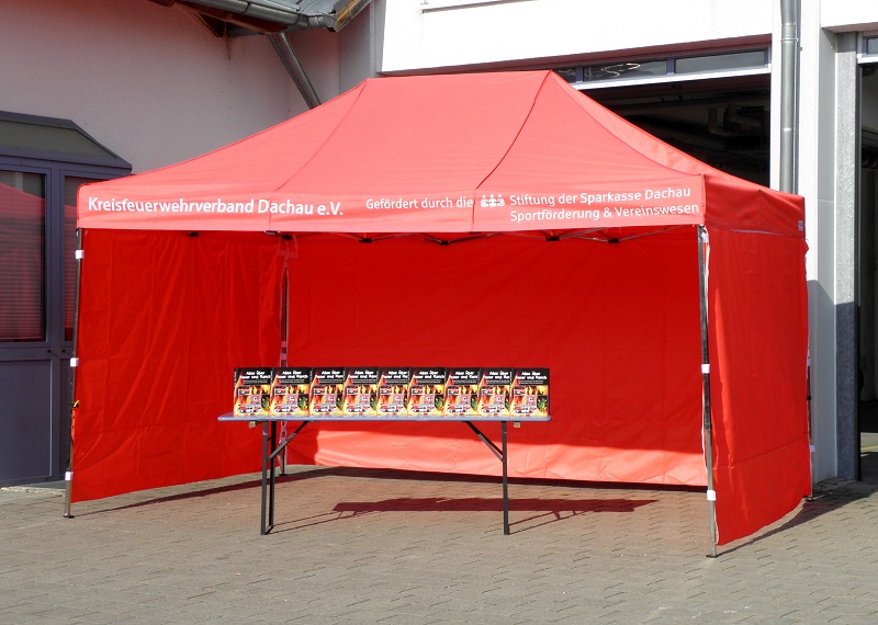 Auch ein Pavillon für den Kreisfeuerwehrverband konnte durch die Ausschüttung angeschafft werden. Der in auffälligem Rot gehaltene Unterstand bietet eine gute Basis, um die Bevölkerung bei Veranstaltungen über die Arbeit der Feuerwehr sowie Präventionsmöglichkeiten zu informieren.