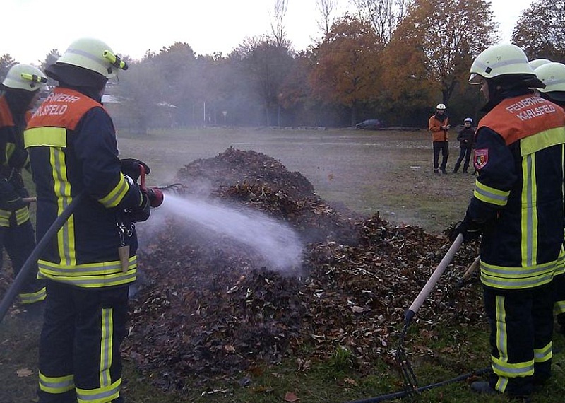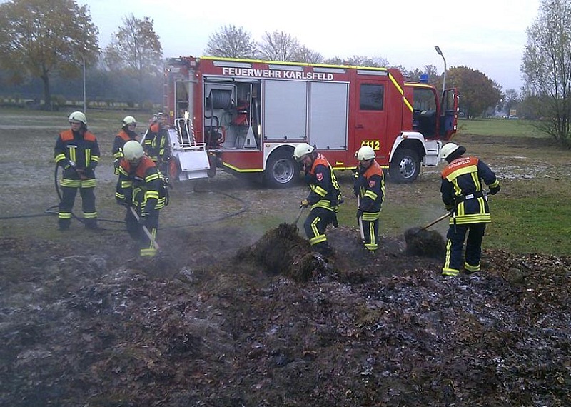 Am Sonntagnachmittag (30.10.2011) brannte es erneut – diesmal auf einer größeren Freifläche im Bereich der Hochstraße/Bajuwarenstraße. Gemeldet wurde ein qualmender Heuhaufen. Im weiteren Verlauf wurde dieser mittels Schnellangriff abgelöscht und mit Heugabeln durch die Einsatzkräfte verteilt. Versteckte Glutnester spürte die eingesetzte Wärmebildkamera auf, auch diese waren schnell abgelöscht. Zum Abschluss der Arbeiten wurde eine Schaumdecke aufgebracht. Die Helfer konnten gegen 16 Uhr wieder in das Gerätehaus einrücken.