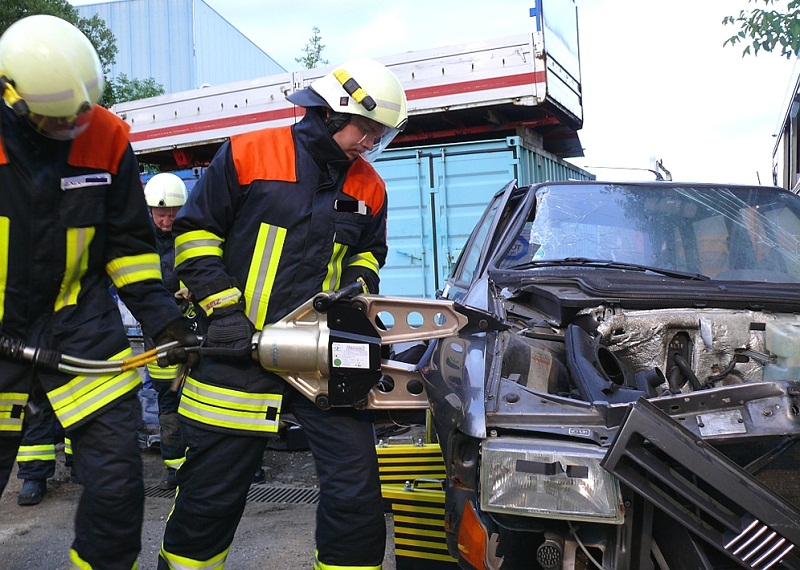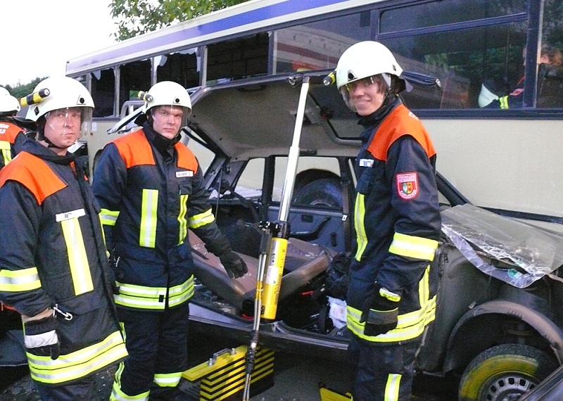 Nach der Simulation übten sich die Teilnehmer im richtigen Umgang mit Spreizer und Schneidgerät am schrottreifen Auto. Die Ausbilder vermittelten verschiedene Methoden zur Entnahme der Glasscheiben aus den Fahrzeugen und gaben Tipps zum richtigen Umgang mit den schweren Rettungsgeräten. Federkörner, Glassäge und Nothammer konnten von der Mannschaft beliebig an den Scheiben des vom TÜV-Süd bereit gestellten, alten Busses getestet werden.