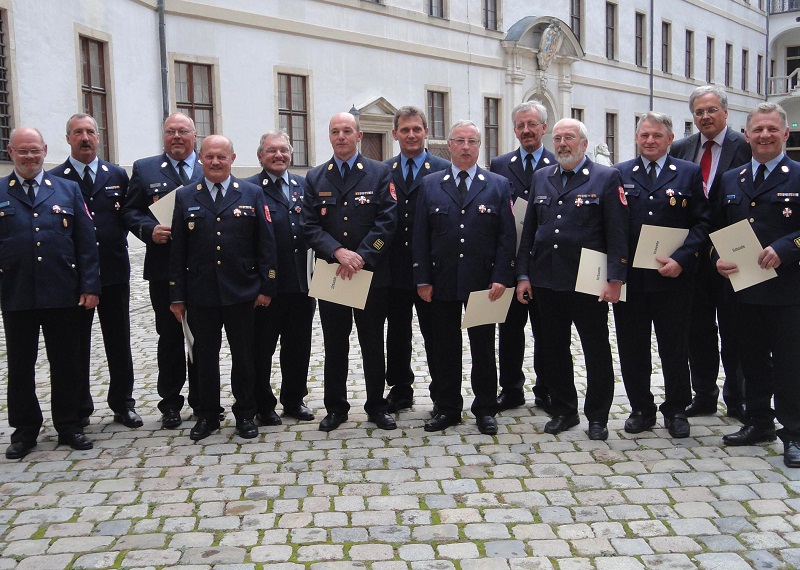 Kreisbrandrat Heinrich Schmalenberg, der an der Feierstunde auf Schloss Neuburg teilnahm, gehörte zu den ersten Gratulanten.