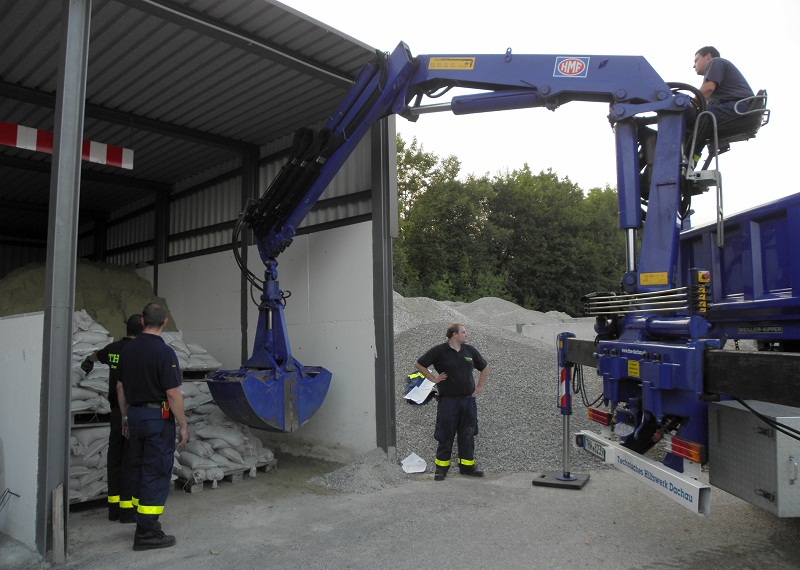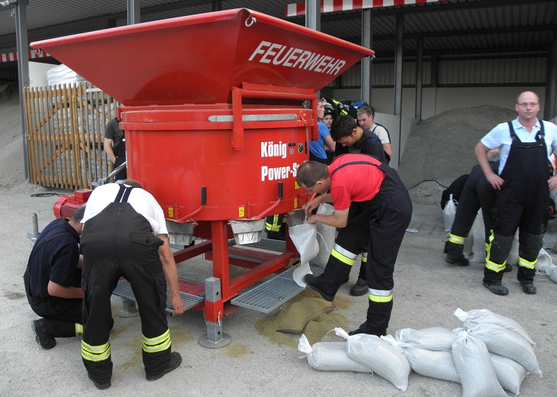 Für kleinflächige Überschwemmungen halten beide Hilfsorganisationen je 500 Sandsäcke bereit. Sollten diese nicht mehr ausreichen, werden mittels einer Sandsackfüllmaschine weitere abgefüllt, auf Paletten verladen und an die jeweilige Einsatzstelle transportiert.