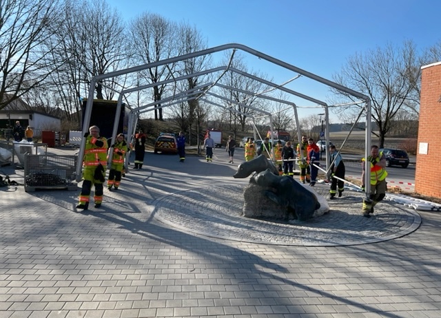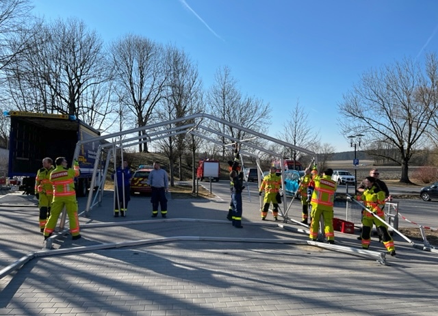 Am vergangenen Freitag (11.03.2022) wurden vor der Turnhalle der Johannes-Neuhäusler-Schule in Schönbrunn durch ehrenamtliche Helfer von Feuerwehr und THW Wartezelte für die ankommenden Flüchtlinge aus der Ukraine aufgebaut. Diese dienen als wettergeschützter Aufnahmebereich, bevor die Familien in der Turnhalle verpflegt und mit dem Nötigsten versorgt werden.