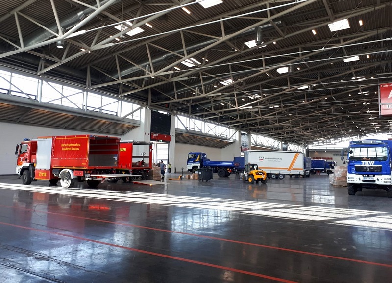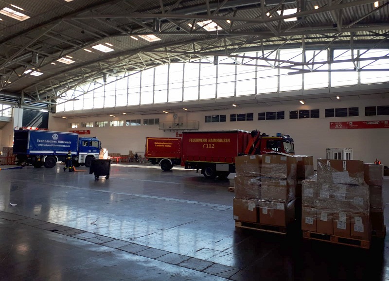 So fanden am Dienstag (07.04.2020) und Mittwoch (08.04.2020) umfangreiche Transportfahrten statt, um die Hotelausstattung gegen eine Klinikausstattung auszutauschen. So wurden Betten, 240 Matratzen und die zugehörige Bettwäsche abtransportiert. Durch den Freistaat Bayern wurde für die Einrichtung der Hilfskrankenhäuser eine entsprechende Ausstattung bis hin zur Kleidung für Ärzte und Pflege beschafft. Diese wurde durch Fahrzeuge von Feuerwehr und THW auf dem Messegelände München übernommen und nach Dachau transportiert.