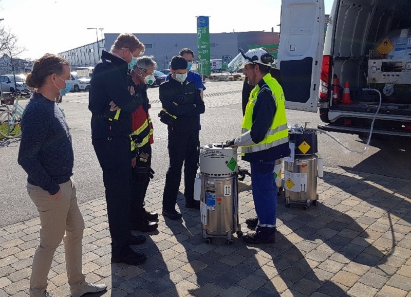 Auch die Systeme für die Versorgung der Patienten mit medizinischem Sauerstoff sind mittlerweile eingetroffen. Um für einen kurzfristigen Betriebsbeginn der Hilfsklinik vorbereitet zu sein, wurden Mitglieder der Kreisbrandinspektion in das Abfüllen von Flüssigsauerstoff in die entsprechenden Behälter eingewiesen. Im Klinikbetrieb soll dies dann durch das anwesende Personal erfolgen.