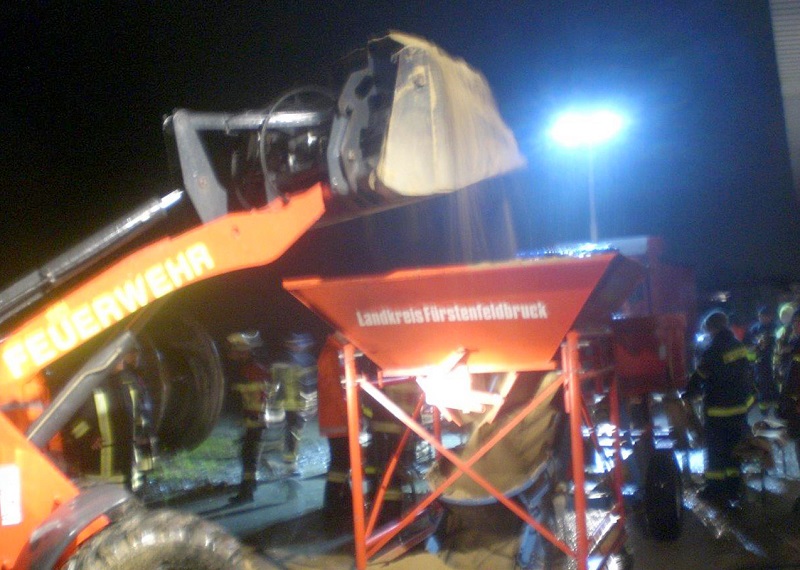 Die zentrale Sandsackfüllung ist dabei eines von mehreren Themen, um Straßen und Häuser vor Wassermassen zu schützen. Beim letzten Hochwasser beispielsweise wurden innerhalb von 24 Stunden mehr als 30.000 Sandsäcke gefüllt und an die Einsatzstellen transportiert. Am vergangenen Dienstag (19.11.2013) haben Kräfte von Feuerwehr und THW deshalb am Bauhof Dachau ein System der Sandsackbefüllung geprobt, wie es die Feuerwehr Eichenau im Landkreis Fürstenfeldbruck betreibt. Bei dem Test sollte eine Verbesserung der Befüllung der Sandsackfüllmaschine des Landkreises Dachau mit einem Förderband getestet werden. Damit wird im Gegensatz zur direkten Befüllung der Maschine mit dem Radlader eine bessere Dosierung erreicht um so eine Überfüllung der Maschine und damit Störungen zu umgehen. Ebenso werden Gefahren für die an der Füllmaschine eingesetzten Einsatzkräfte vermieden, da der Radlader seinen Wirkungskreis nicht mehr in deren unmittelbarer Nähe hat. Daneben gestaltet sich der Füllbetrieb durch das Förderband effektiver.