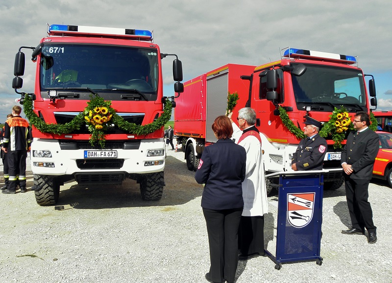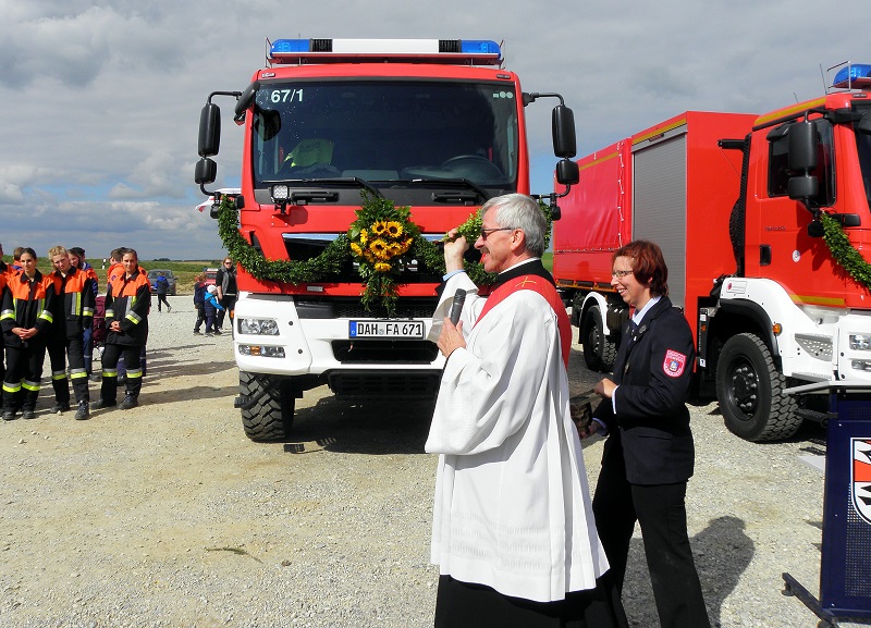 Nach dem gemeinsamen Mittagessen segnete Feuerwehrseelsorger und Diakon Albert Wenning zwei langersehnte Einsatzfahrzeuge, welche dem Landkreis Dachau vom Bund im Rahmen des Katastrophenschutzes zur Verfügung gestellt werden. Es handelt sich bei um einen Gerätewagen „Dekon-P“, welcher bei der Feuerwehr Altomünster stationiert wird, sowie einen Schlauchwagen, der bei der Feuerwehr Eisenhofen beheimatet sein wird.
