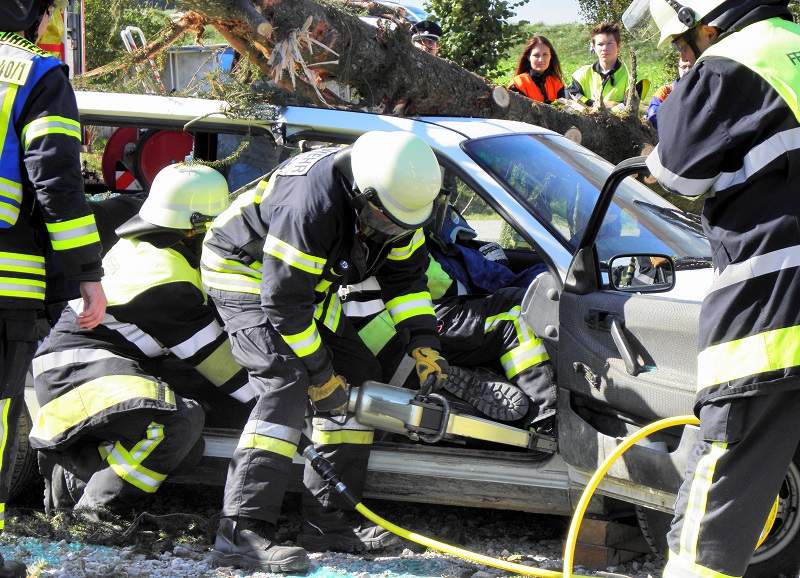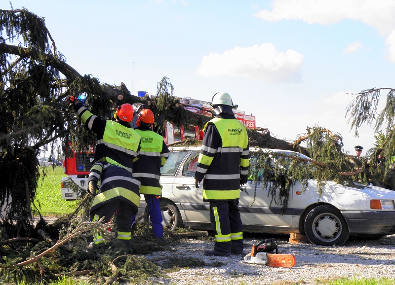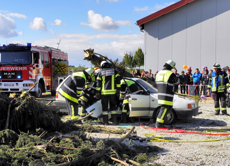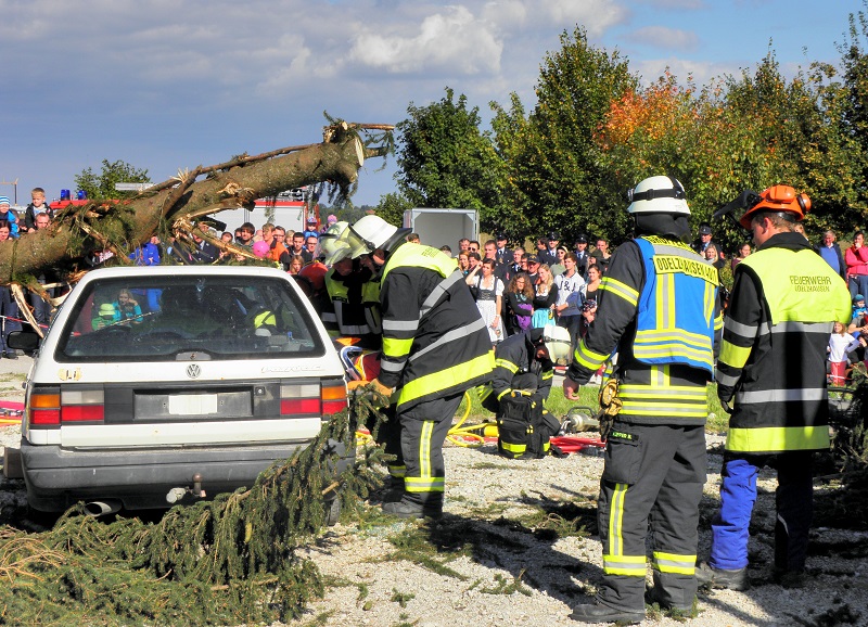 Was die Feuerwehren leisten können, demonstrierten die Floriansjünger aus Odelzhausen und Egenhofen in einer eindrucksvollen Vorführung. Vor den Augen der interessierten Zuschauer lies man zwei Baumstämme auf ein Auto fallen. Darin platziert war eine Übungspuppe, die es nun zu retten galt. Mit der Motorsäge rückten die Kräfte aus Odelzhausen den Stämmen zu Leibe und befreiten anschließend die Puppe mit hydraulischem Rettungsgerät. Moderiert wurde die Übung von Klaus Reindl, der die Rettungskette vom Notruf bis zur Personenbefreiung erklärte und dabei immer wieder das Publikum einbezogen hat.