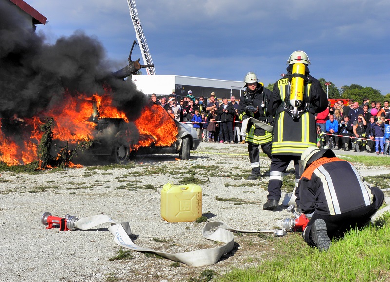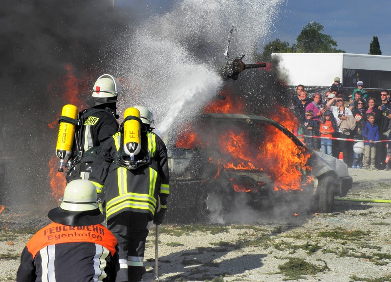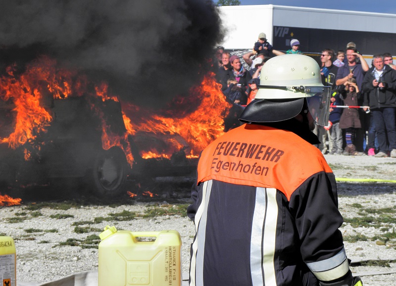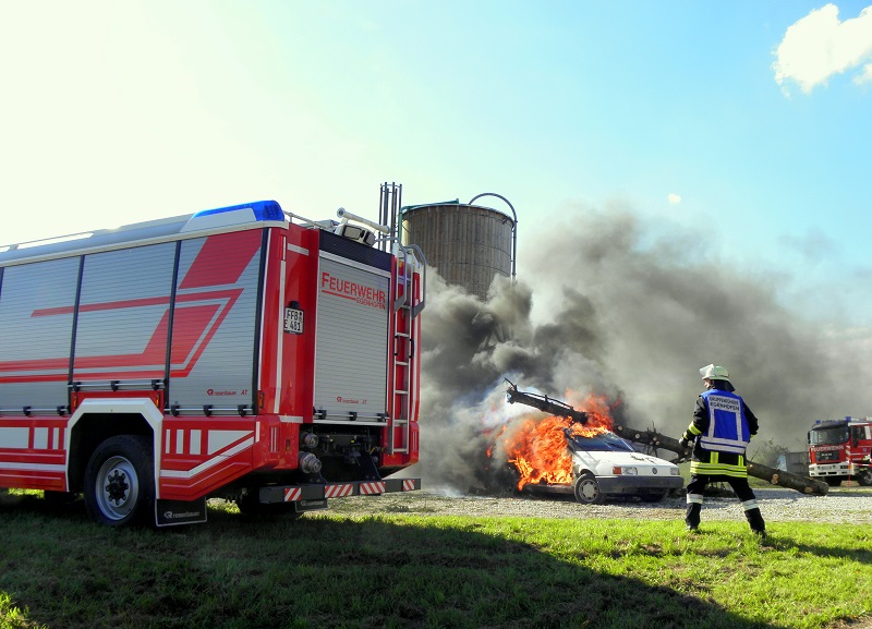 Dass die Feuerwehr auch Flammen in kürzester Zeit unter Kontrolle bringt, zeigten gleich im Anschluss die Egenhofener Einsatzkräfte. Unter schwerem Atemschutz bekämpften sie einen PKW-Brand, nachdem sich über dem Bauhofgelände von Pfaffenhofen schon eine schwarze Rauchwolke gebildet hatte.