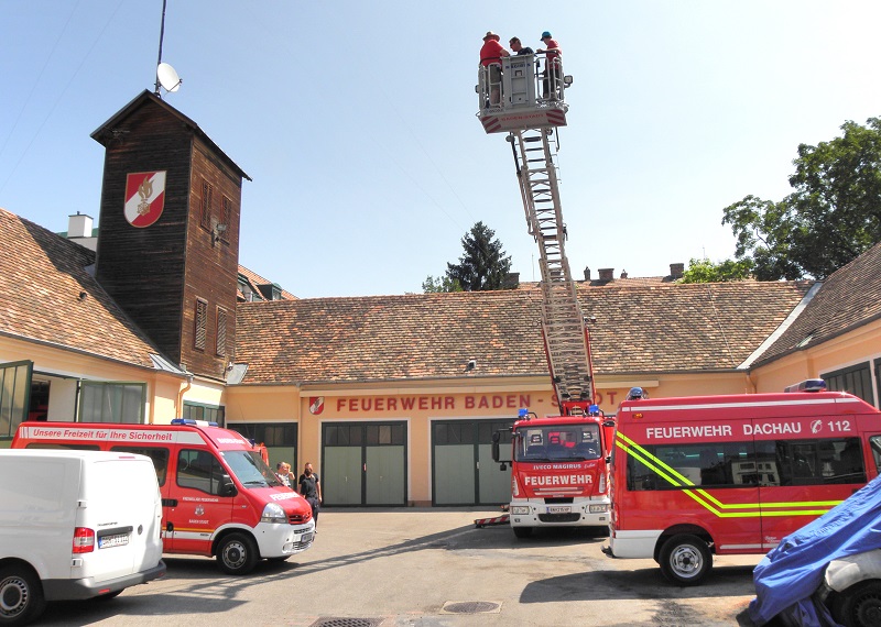 Der Kommandant Gerald Peter informierte uns ausführlich über die drei bestehenden Feuerwehren in Baden und deren Aufgaben. Zwei Fahrzeuge der Wehr waren für uns besonders interessant; zum einem die Drehleiter, die erst vor wenigen Jahren in Dienst gestellt wurde und zum anderen ein Vorausrüstfahrzeug, das genau auf die Bedürfnisse der Feuerwehr Baden-Stadt zugeschnitten wurde. Hier konnten wir uns beim Austausch wieder einige tolle Ideen für zu Hause mitnehmen. Natürlich durfte auch eine Fahrt mit der Drehleiter in luftige Höhen nicht fehlen, von wo aus wir einen herrlichen Blick über die Badener Altstadt genießen konnten.