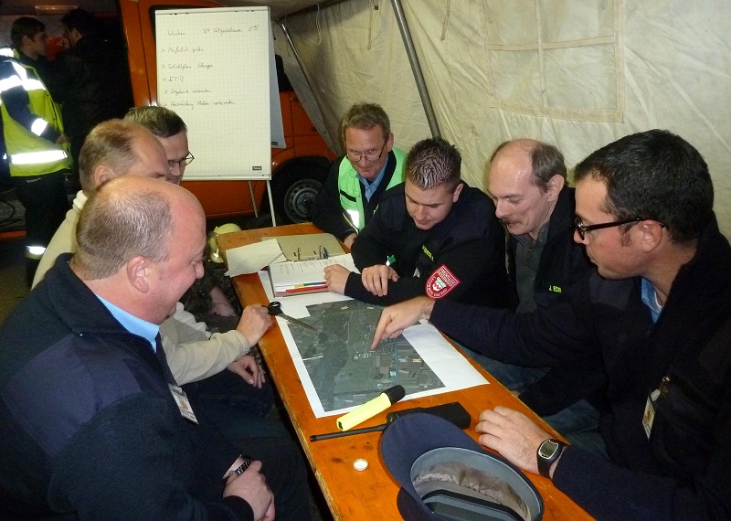 Weiterer Schwerpunkt der Übung war der Aufbau einer Führungs- und Kommunikationsstruktur in einem fremden Landkreis, um die Kräfte geordnet in den verschiedenen Einsatzabschnitten führen zu können. Zum Einsatz kam hierfür die Unterstützungsgruppe Örtliche Einsatzleitung mit entsprechend geschultem Personal.