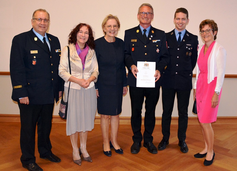 Auf dem Bild v.l.nr.: Kreisbrandrat Franz Bründler, stv. Landrätin Marianne Klaffki, Regierungspräsidentin Maria Els, Kreisbrandinspektor Georg Reischl, Sohn Christian Reischl und Ehefrau Helga Reischl