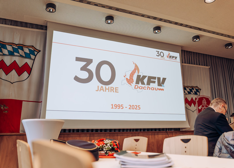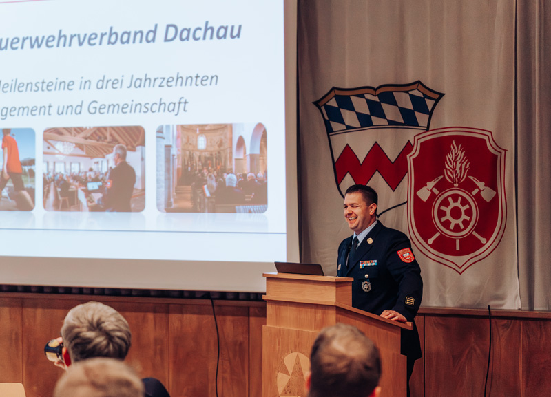 Im Anschluss an den Gottesdienst fanden sich die mehr als 100 Gäste zur Jubiläumsveranstaltung anlässlich des 30-jährigen Bestehens des Kreisfeuerwehrverbands Dachau im Unteren Haus Petersberg ein, wo sie von Kreisbrandinspektor Thomas Burgmair willkommen geheißen wurden. Der Kreisfeuerwehrverband feierte damit seine Wiedergründung im Jahr 1995, als sich 62 Feuerwehren des Landkreises im Bürgerhaus Kleinberghofen zusammenschlossen – ein Meilenstein, der auf Initiative des damaligen Kreisbrandrats Erwin Zehrer zustande kam.