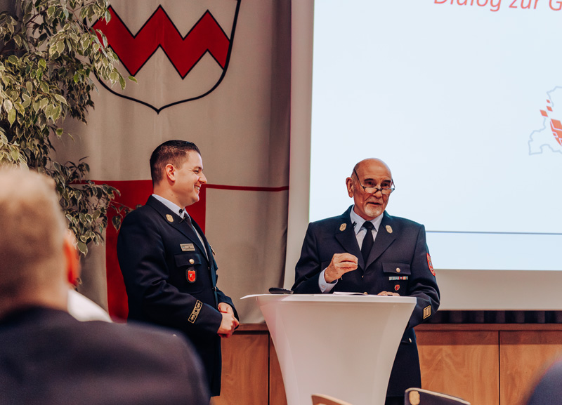 Ein Höhepunkt des Abends war der dialogisch gestaltete Rückblick mit Ehrenkreisbrandrat Erwin Zehrer, der die Gäste auf eine Zeitreise durch die Historie und Entstehungsgeschichte des Verbandes mitnahm. Er sprach über die Herausforderungen der Wiedergründung 1995, über anfängliche Skepsis in einigen Gemeinden – aber auch über die Überzeugungsarbeit, die schließlich alle Feuerwehren zum Beitritt bewegte.