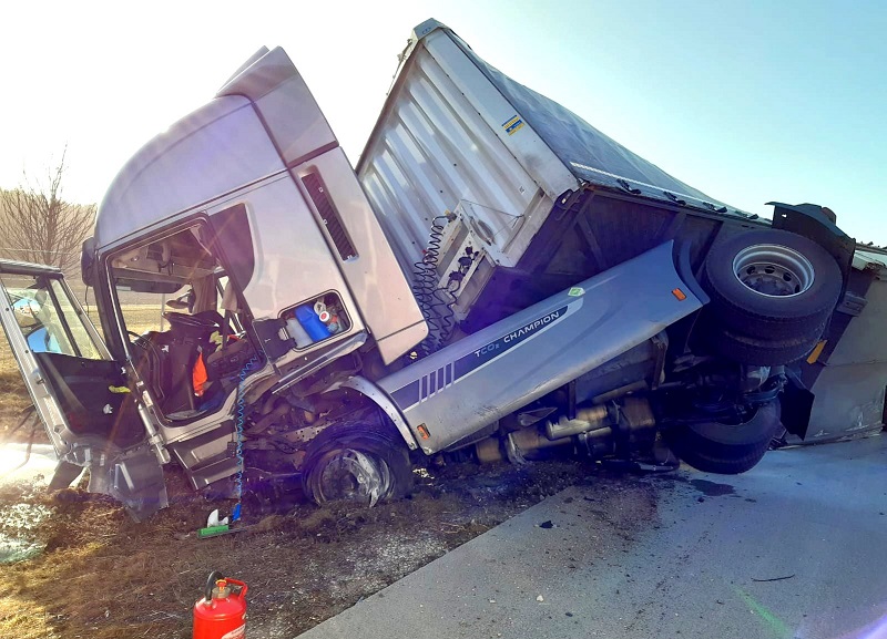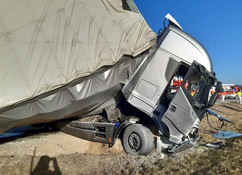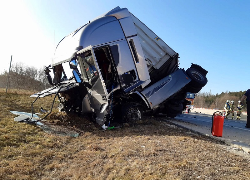 Währenddessen schleuderte der Sattelzug nach rechts in den Grünstreifen, wo er auf die Seite kippte. Ein nachfahrender Mercedes konnte nicht mehr rechtzeitig ausweichen und fuhr in den umgestürzten Auflieger.