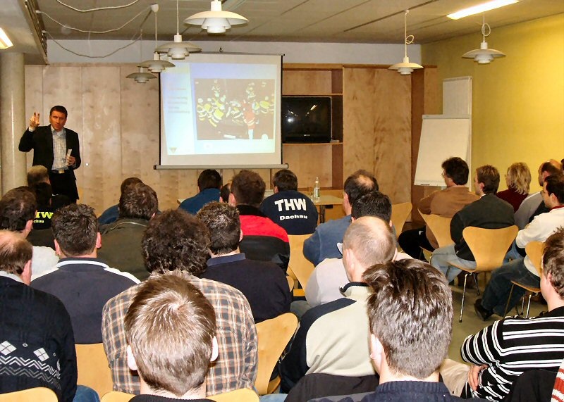 Über 70 Angehörige von Feuerwehren des Landkreises, Notärzten, Rettungsdienst und Technisches Hilfswerk waren im Dachauer Feuerwehrhaus eingeladen; dort fand eine Fortbildung zum Thema: „Verkehrsunfall – angepasste Technik aufgrund technischer Rahmenbedingungen im Fahrzeugbau“ statt. In einem zweistündigen Vortrag mit anschließender Diskussion referierte Gerhard Schmöller vom Trainingszentrum für Rettungsmedizin der Berufsfeuerwehr München ausführlich zu dieser Thematik.Dabei wurden Rettungsmaßnahmen von verletzten und eingeklemmten Personen, Erstmaßnahmen, Absicherung und Brandschutz, sowie Gerätebereitstellung sowohl bei Pkw-, als auch bei Unfällen mit Lkw´s angesprochen. Weitere Themen waren u.a., die medizinische Versorgung, Einsatz von technischem Gerät, wie Rettungsschere, -spreizer und –zylinder und Airbags. Kreisbrandrat Rudi Reimoser bedankte sich zum Abschluß bei Schmöller im Namen aller Rettungsorganisationen mit einem Präsent für den äußerst interessanten und informativen Vortrag.