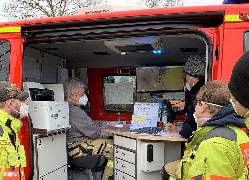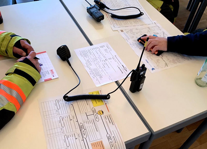 Aufgrund der notwendigen räumlichen Aufteilung zur Einhaltung der Abstandsregeln war das Ausbilderteam an den beiden Samstag mit 5 bzw. 6 Ausbildern im Einsatz, um die praktischen Übungen zur Arbeit in der Einsatzleitung zu begleiten.
