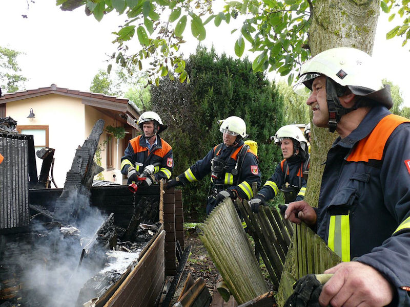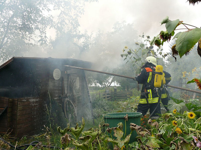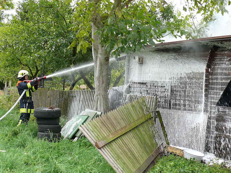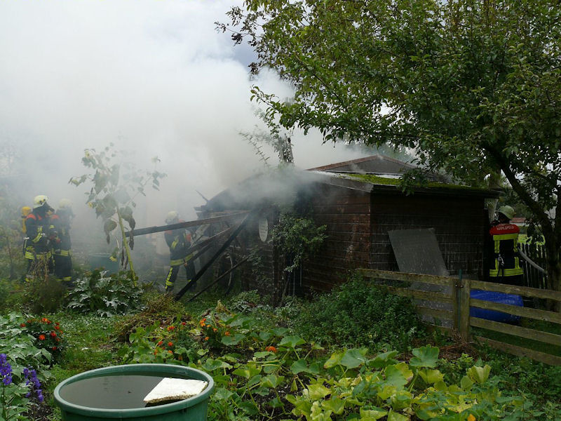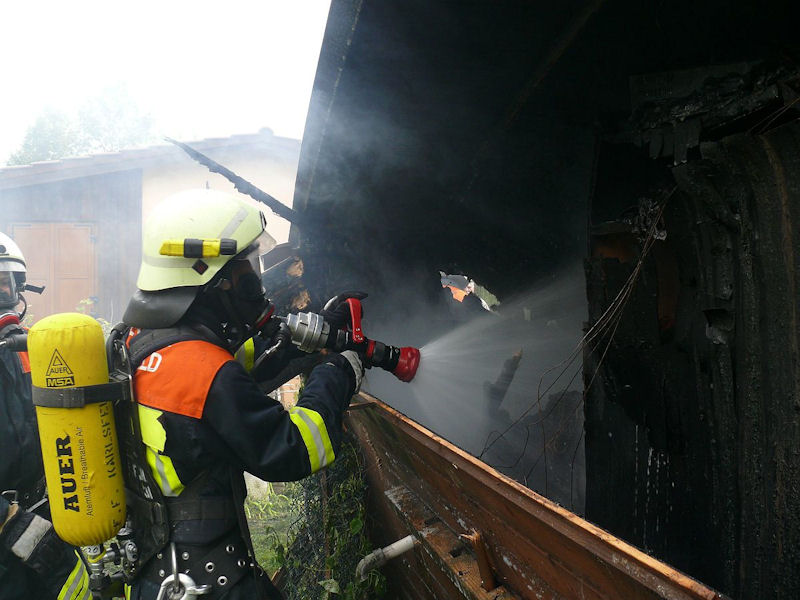 Zu einem Gartenhausbrand musste die Feuerwehr Karlsfeld am 04. September ausrücken, welcher sich gegen Mittag in der Nähe des Waldschwaigsees in Karlsfeld ereignete. Beim Eintreffen des ersten Löschfahrzeuges befand sich das Objekt bereits in Vollbrand. Ein Trupp mit zwei Mann begann unter schwerem Atemschutz mit Hilfe des im Fahrzeug befindlichen Schnellangriffsrohres umgehend mit den Löscharbeiten. Ein weiterer Trupp verhinderte ein Übergreifen des Feuers auf das benachbarte Wohnhaus. Einige Gasflaschen, welche sich in unmittelbarer Nähe zum brennenden Gebäude befanden, konnten noch rechtzeitig entfernt und mit Löschwasser gekühlt werden. Mittels eines speziellem Druckluft-Schaum-Wasser Gemisches, genannt „CAFS“, konnte das Feuer schnell und sicher abgelöscht werden. Da das instabile Dach des Brandobjektes schon nach kurzer Zeit einstürzte, mussten einzelne Teile mit einer so genannten Rettungssäge Stück für Stück abgetragen werden. Vereinzelte Glutnester konnten so besser erreicht werden. Zur Unterstützung rückte ein weiteres Löschgruppenfahrzeug und der Versorgungs - LKW an, 15 Mann waren zwei Stunden mit den Arbeiten vor Ort beschäftigt. Die Einsatzstelle wurde im Anschluss Brandfahndern der Kriminalpolizei übergeben. Die Ursache des Brandes ist bislang noch unklar.