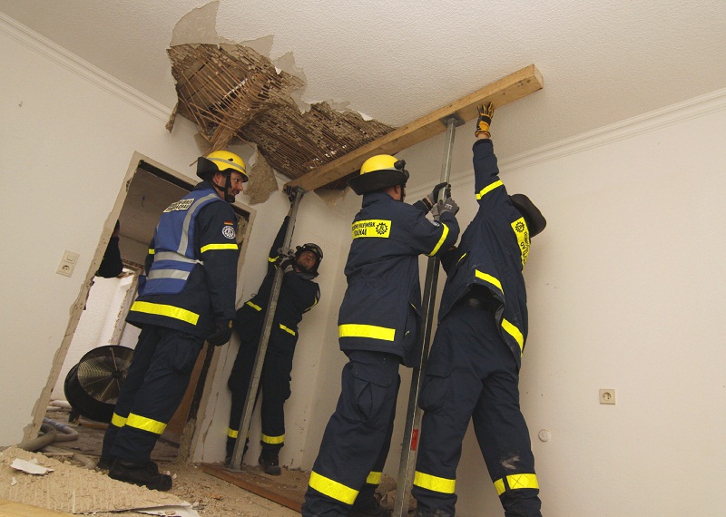 In der Zwischenzeit stützten THW-Helfer die Decke zum Obergeschoß mit speziellen Windenstützen ab, um die Rettung und Versorgung der dort befindlichen Personen möglich zu machen.