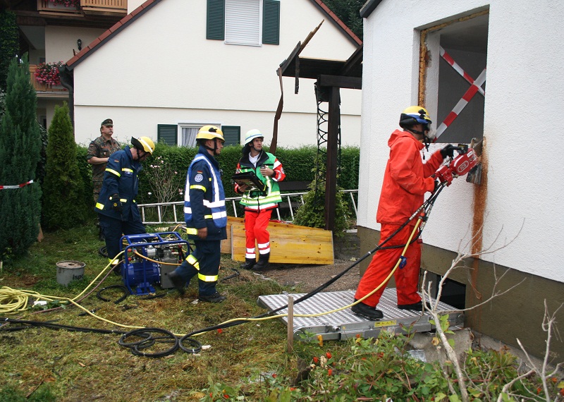 Mit mehreren Fahrzeugen rückte die Feuerwehr Röhrmoos in die Schillhofener Straße aus. Unter schwerem Atemschutz erkundeten die Feuerwehrkräfte die verrauchten Räume und suchten nach verletzten Personen . Durch die Explosion waren teilweise Zugänge in einzelnen Räumen versperrt, des Weiteren war der Boden des 1. Obergeschoßes einsturzgefährdet. Bei dieser Aufgabe war das THW gefragt: Mit der Betonkettensäge wurde durch die THW Kräfte ein erschütterungsfreier Zugang in die Räume verschafft um die Verletzten zu befreien.