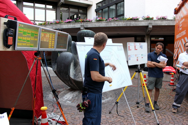 Um die Möglichkeiten und Fähigkeiten der jeweils anderen Einheit kennen zu lernen wurden jeweils alle vorgehalten Führungs- und Kommunikationsmittel aufgebaut und in Betrieb genommen. Nach dem die Technik und die Lagekarte aufgebaut war gab es einen gemeinsamen Lagevortrag mit dem Ziel für die angenommene Schadenslage die Entscheidung über den Einsatz eines Örtlichen Einsatzleiter zu treffen. Im Anschluss wurden die Fahrzeuge und Ausrüstung ausgiebig besichtigt und in gemeinsamen Diskussionen Ideen für eine erfolgreiche Zusammenarbeit geboren.