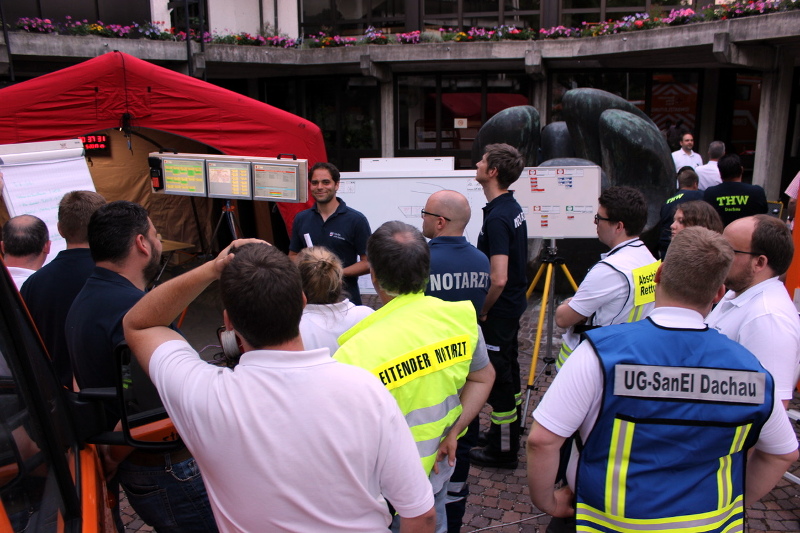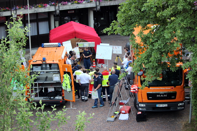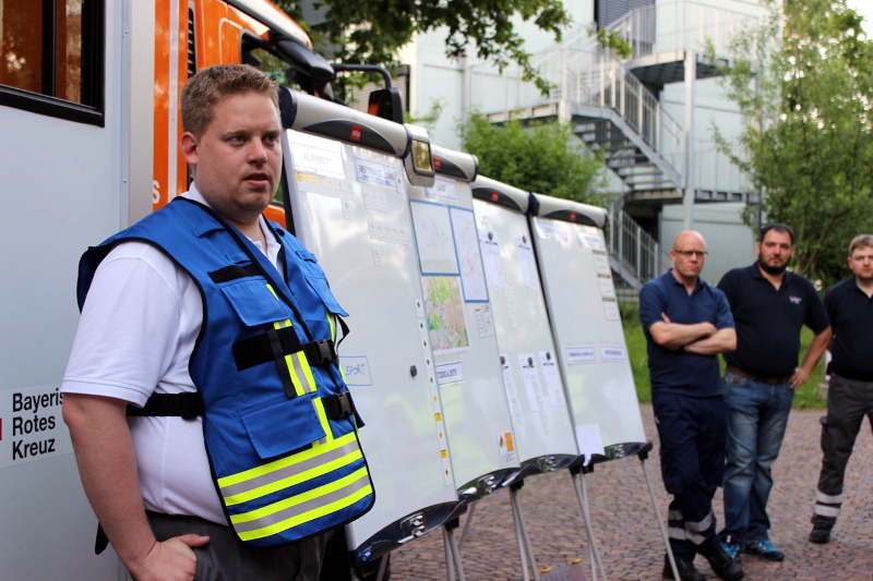Am Mittwoch (31. 05.2017) fand eine gemeinsame Übung der beiden Unterstützungsgruppen Örtlicher Einsatzleiter (UG-ÖEL) und Sanitätseinsatzleitung (UG-SANEL) statt.Martin Seidl und Sebastian Hörnig, die beiden Leiter der Unterstützungsgruppen konnten neben ihren Mitarbeitern auch Vertreter der vorbestellten Einsatzleiter und Leitenden Notärzten sowie des Landratsamt es begrüßen. Ziel der Übung war es, dass sich die beiden Gruppen welche im Einsatzfall eng zusammen arbeiten müssen kennen lernen. Am Beispiel einer angenommen Einsatzlage, einem Gebäudeeinsturz mit einer Vielzahl von Verletzten und Betroffenen, wurde eine gemeinsame Führungsstelle errichtet und die Lage auf der Lagekarte dargestellt.