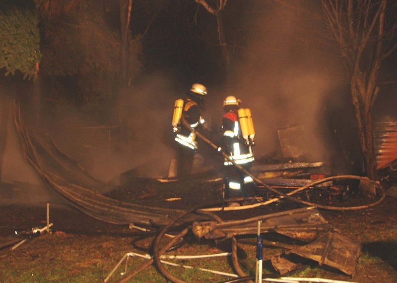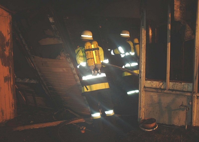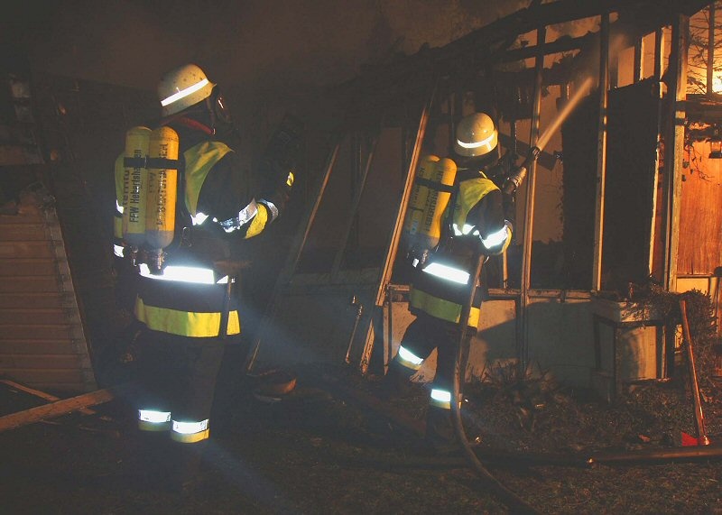 Feuerwehrmänner, mit schwerem Atemschutz ausgerüstet, setzten zwei C-Rohre zur Brandbekämpfung ein und konnten somit auch verhindern, dass die Flammen auf ein angrenzendes Haus übergriffen.