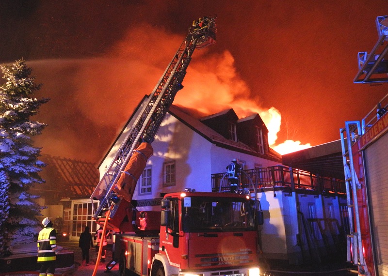 „Brand einer Schreinerei“ lautete die Einsatzmeldung für ein Großaufgebot der Feuerwehr am Montagnacht (26.01.2015) gegen 23.20 Uhr. Ein weithin sichtbarer Feuerschein weiste den Rettungskräften bereits den Weg zur Einsatzstelle am Schlossberg in Taxa (Gemeinde Odelzhausen), beim Eintreffen standen die Werkhallen sowie ein Bürogebäude bereits im Vollbrand.