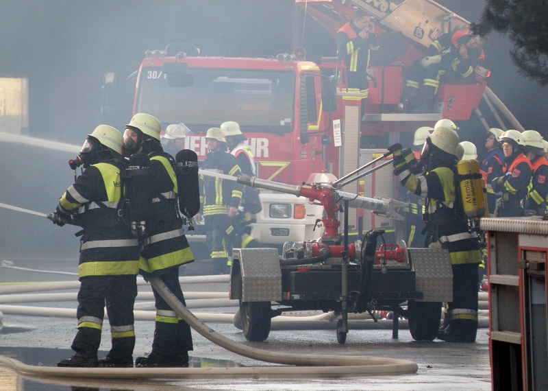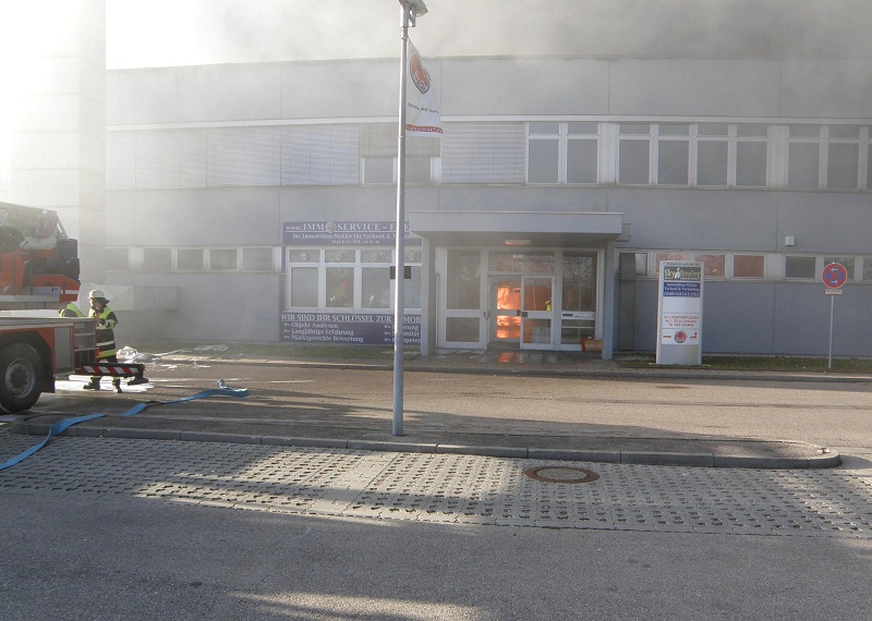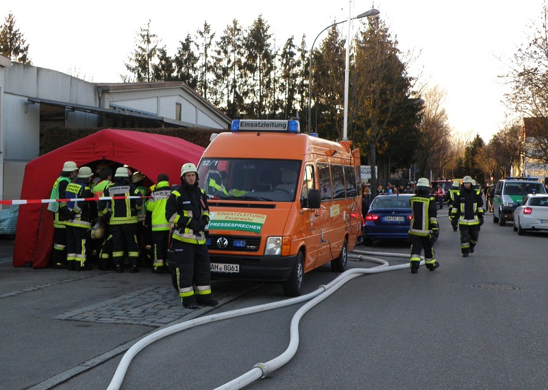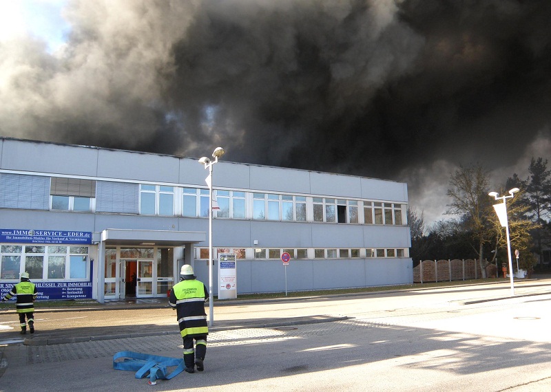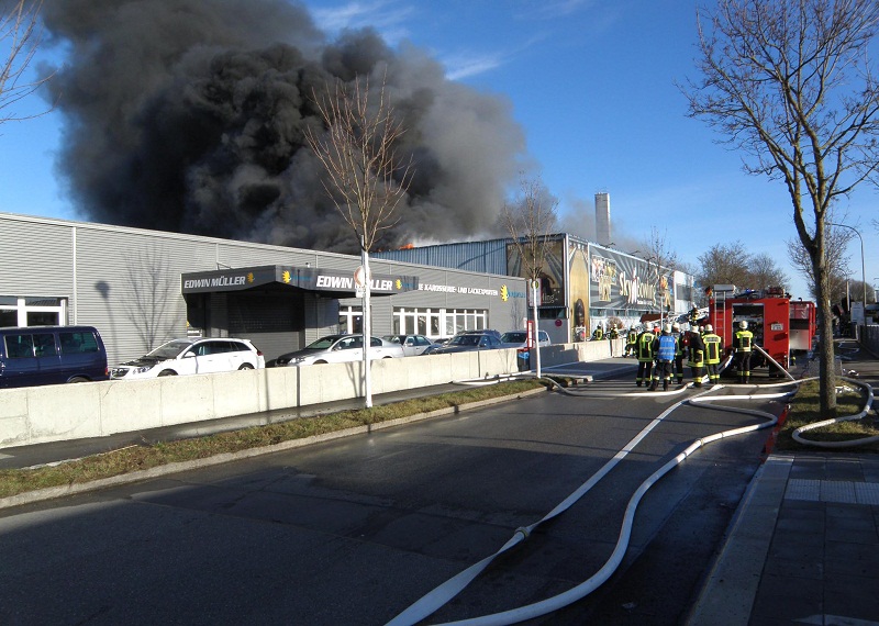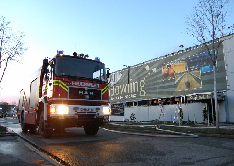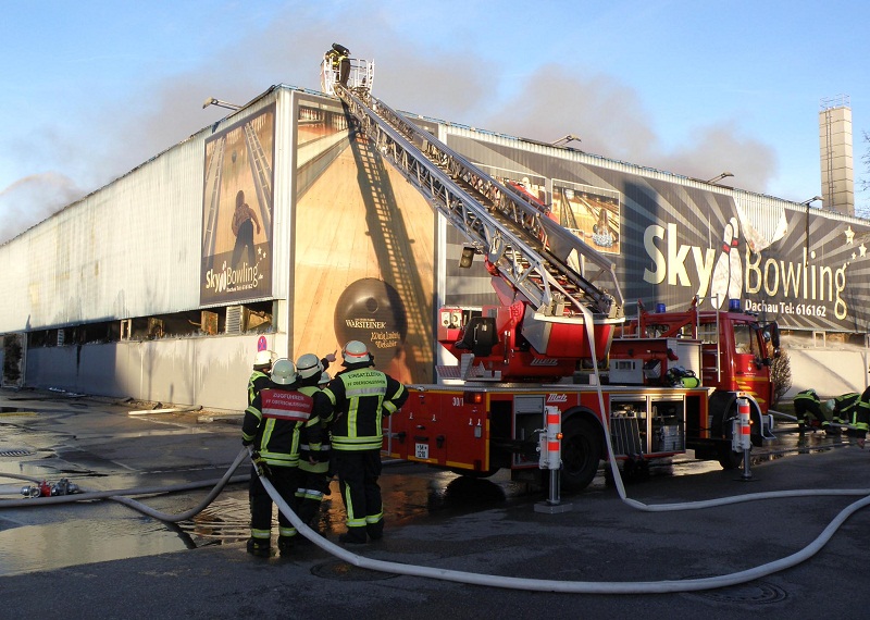 Am Dienstag, den 03. Januar 2012 kam es kurz nach 13 Uhr zu einem Großbrand in einer etwa 50 x 50 Meter großen Halle in der Robert-Bosch-Straße im Gewerbegebiet Dachau Ost, die als Bowlingbahn, Squashcenter und Fitnessstudio genutzt wird. Bereits bei der Alarmierung der Einsatzkräfte war eine dunkelschwarze Rauchsäule weithin sichtbar.Aufgrund der Alarmmeldung wurden Einsatzkräfte aus Dachau, Pellheim, Karlsfeld, Hebertshausen, Günding, Oberschleißheim und Badersfeld alarmiert. Zur Zeit des Brandausbruchs befanden sich noch drei Personen im Gebäude, die sich zum Glück noch rechtzeitig in Sicherheit bringen konnten.
