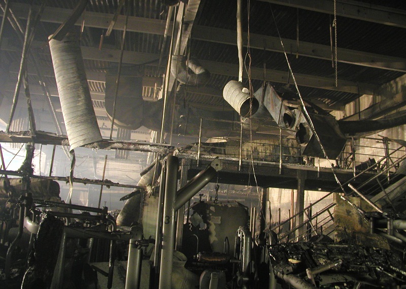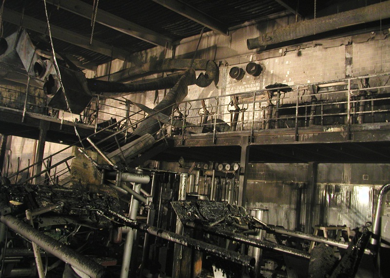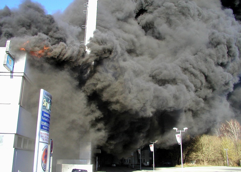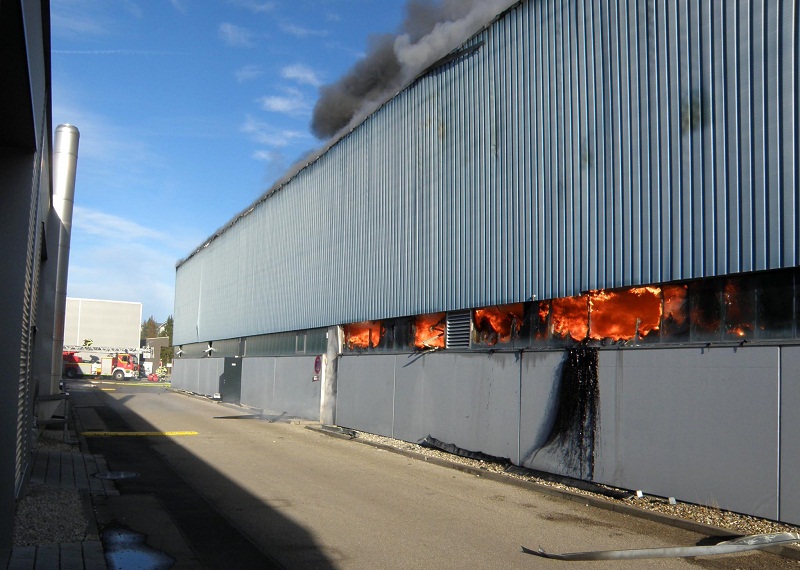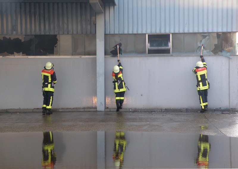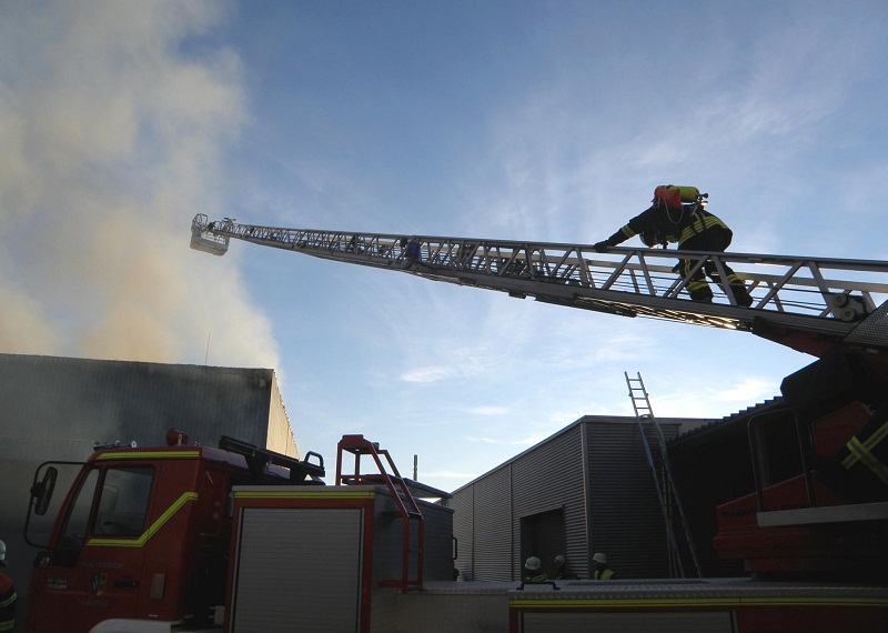Beim Eintreffen der ersten Kräfte schlugen Flammen aus allen Lichtkuppeln des Flachdaches. Der Süd-Westwind trieb die dicken schwarzen Rauchschwaden zum Glück von der Stadt weg in Richtung freie Felder.