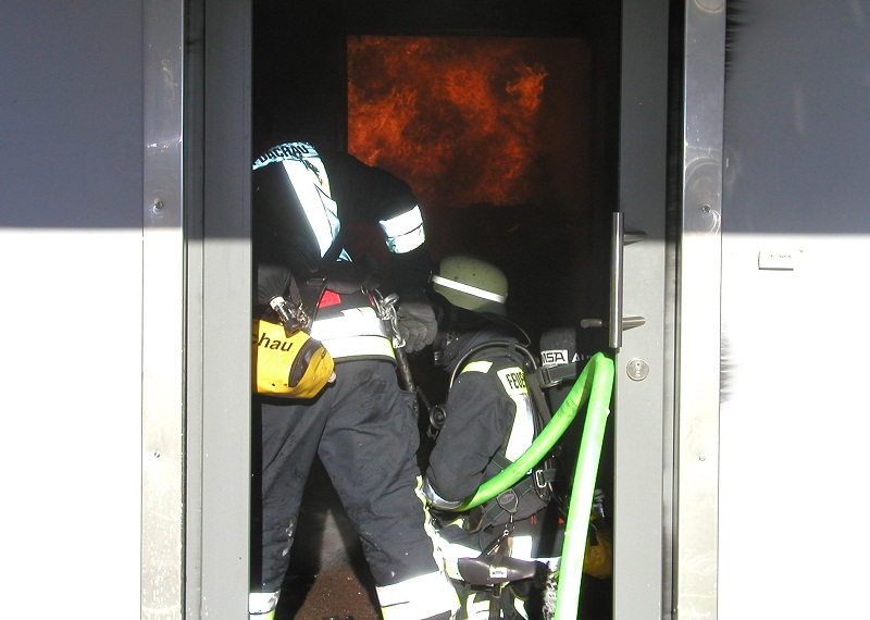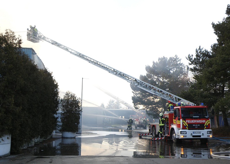 Die Drehleitern aus Dachau, Karlsfeld und Oberschleißheim wurden an den Hausecken positioniert und löschten durch die Dachöffnungen. Mit mehreren C- und B-Rohren sowie Wasserwerfern wurde durch Türen und Fenster in die Halle gespritzt. Ein Innenangriff war von Anfang an nicht mehr möglich.