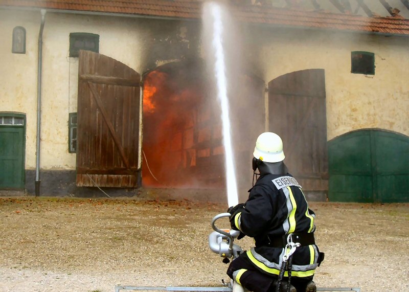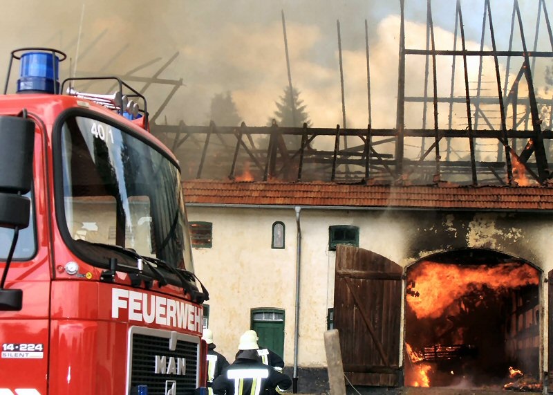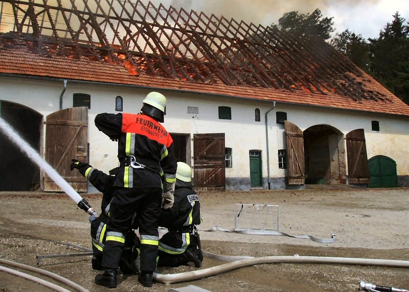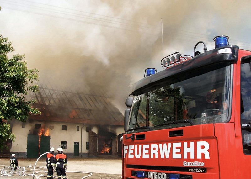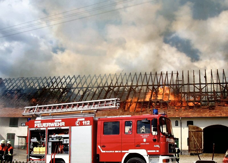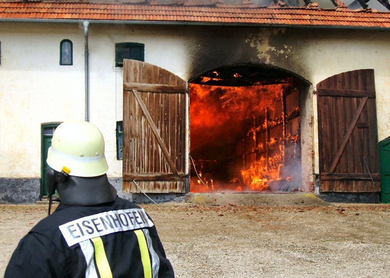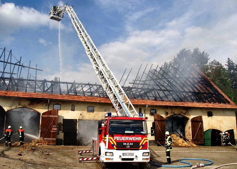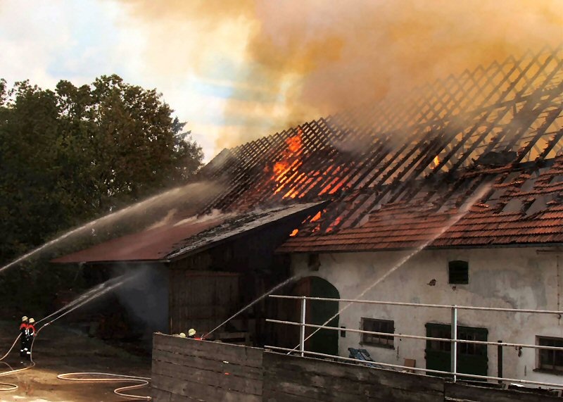 Aus noch ungeklärter Ursache kam es in den Nachmittagsstunden des Pfingstsamstages gegen 15.00 Uhr in einem landwirtschaftlichen Anwesen zu einem Großbrand; die dort eingelagerten Erntevorräte, sowie landwirtschaftliches Gerät wurden dabei ein Raub der Flammen. Durch den schnellen Einsatz der Feuerwehren konnte jedoch verhindert werden, dass das Feuer auf das Wohnhaus und eine Gerätehalle übergriffen. Erschwert wurden die Löscharbeiten durch Wassermangel; neben den vorhandenen Hydranten und Förderleitungen vom Zeitlbach musste zudem ein Pendelverkehr mit Tanklöschfahrzeugen eingerichtet werden, um den Flammen Herr zu werden. Die alarmierten Feuerwehren setzten neben drei Wasserwerfern mehrere Rohre der Stärken B und C ein – wertvolle Hilfe leistete dabei die Drehleiter der Dachauer Feuerwehr, die den Brand mittels eines Wenderohres von oben bekämpfte. Im Einsatz befanden sich die Feuerwehren Altomünster, Dachau, Eisenhofen, Hohenzell, Indersdorf, Kiemertshofen, Kleinberghofen, Oberzeitlbach, Odelzhausen, Unterweikertshofen und Wollomoos mit insgesamt 96 Einsatzkräften. Bei den Löscharbeiten zogen sich zwei Feuerwehrmänner leichte Verletzungen zu, wobei einer von einem in Panik geratenen Pferd getreten wurde; Beide wurden von Notarzt und Rettungsdienst, die mit 15 Kräften und mehreren Fahrzeugen vor Ort waren, ambulant behandelt.
